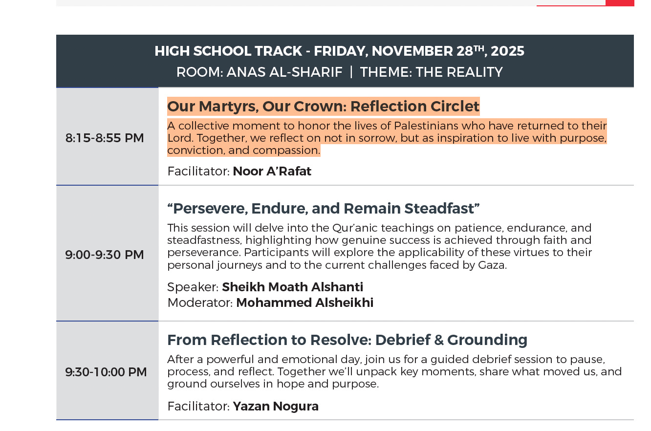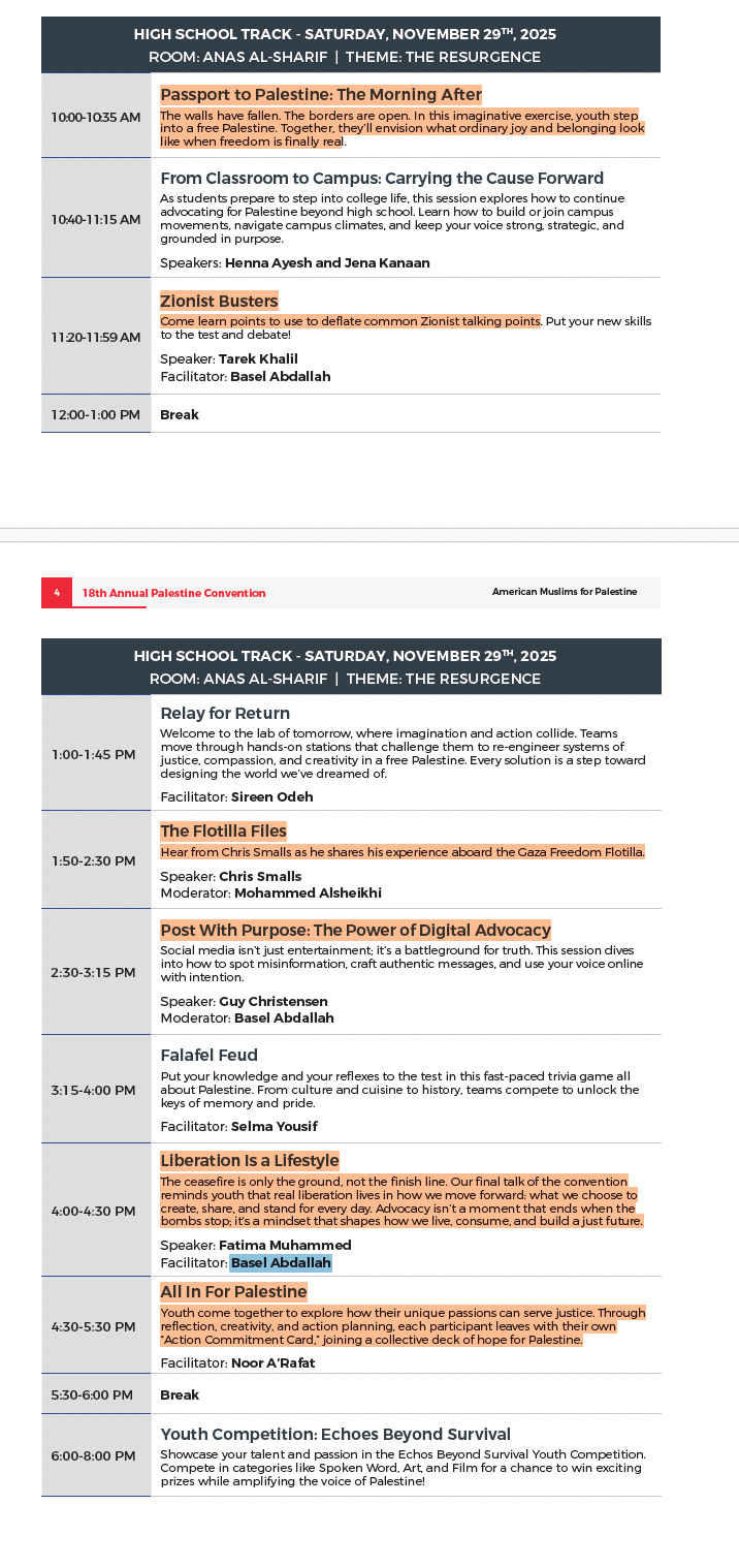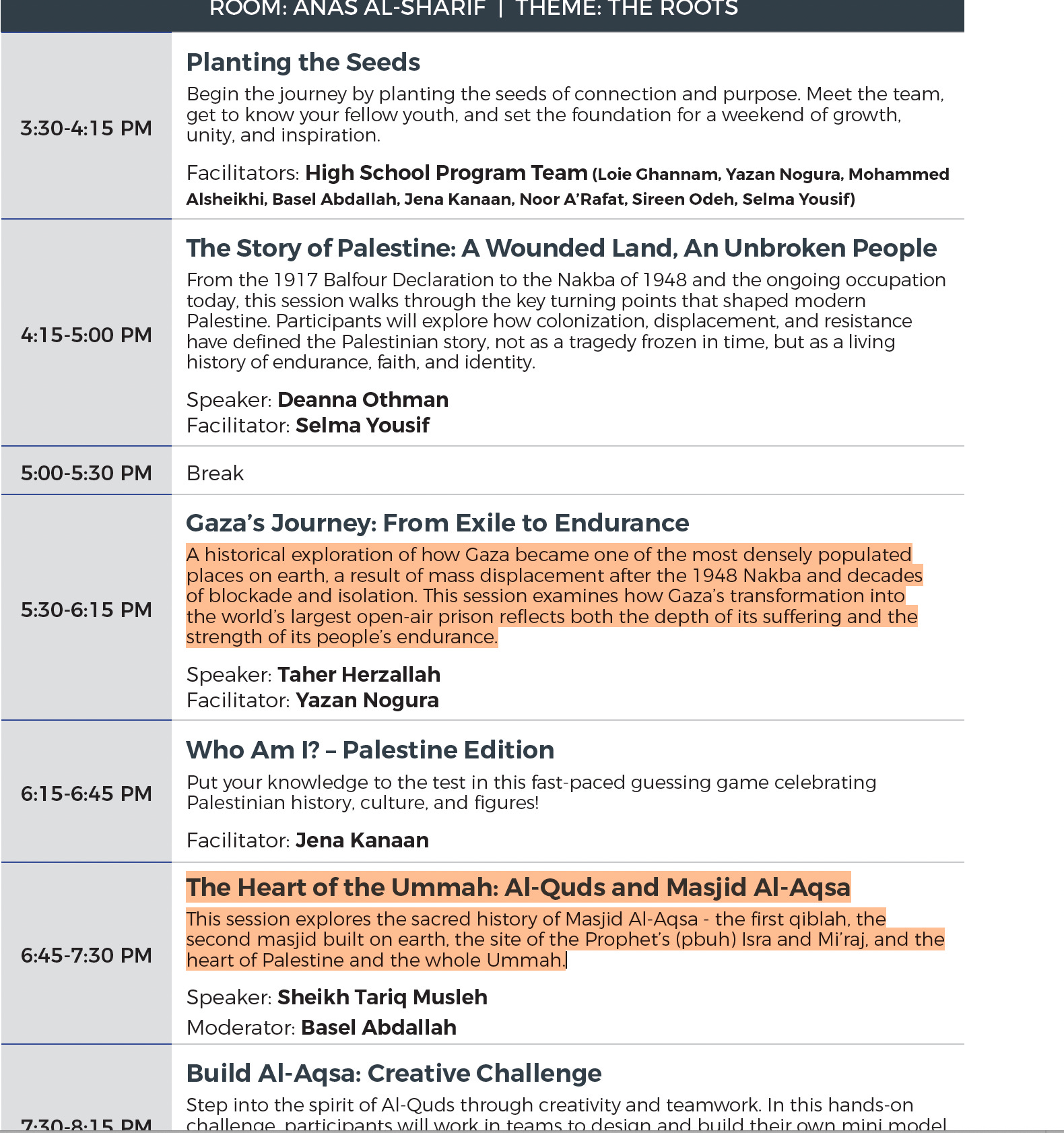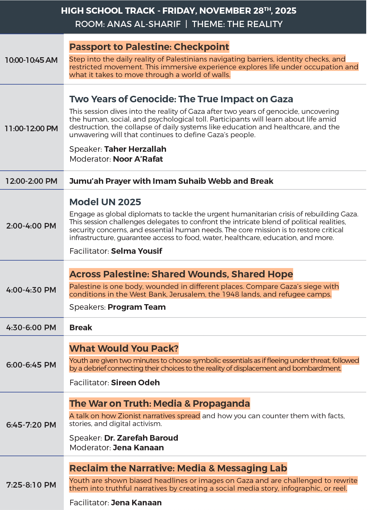 The Convention High School Track is a three-day journey designed to educate, empower, and inspire youth to take action for Palestine. This year’s program follows the timeline of Palestine, beginning with its deep roots and ancient history, moving into the present-day realities of occupation, displacement, and genocide.
