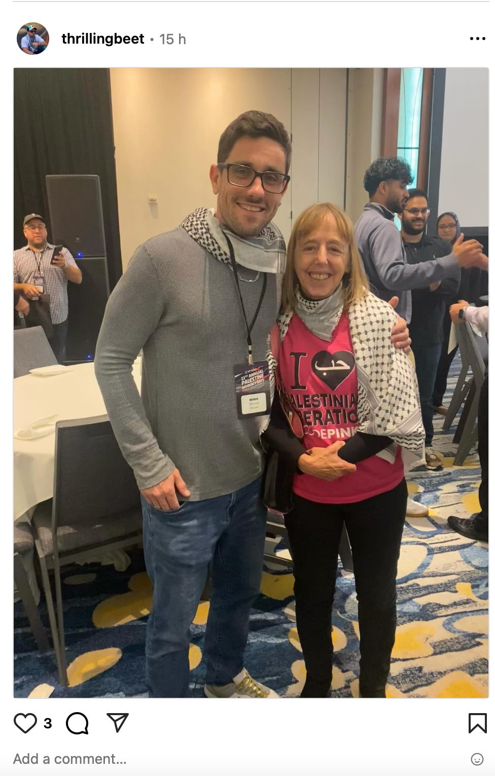 Here he is with Medea Benjamin, of CodePink. Senator Tom Cotton has asked the attorney general to investigate CodePink for potential violations of the Foreign Agents Registration Act (FARA) and material support of terror organizations. Cotton’s letter notes CodePink’s support for individuals and collaboration with organizations connected to the Popular Front for the Liberation of Palestine He also notes that CodePink’s co-founder, Jodie Evans, is married to Neville Roy Singham, a billionaire tech executive with links to the Chinese Communist Party. Code Pink is in large part funded by organizations tied to Singham.