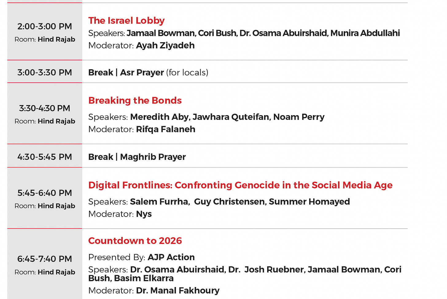 Other sessions on the final day include “Liberation is a Lifestyle” and “All in for Palestine,” in which students will develop an “Action Commitment Card” for Palestine.