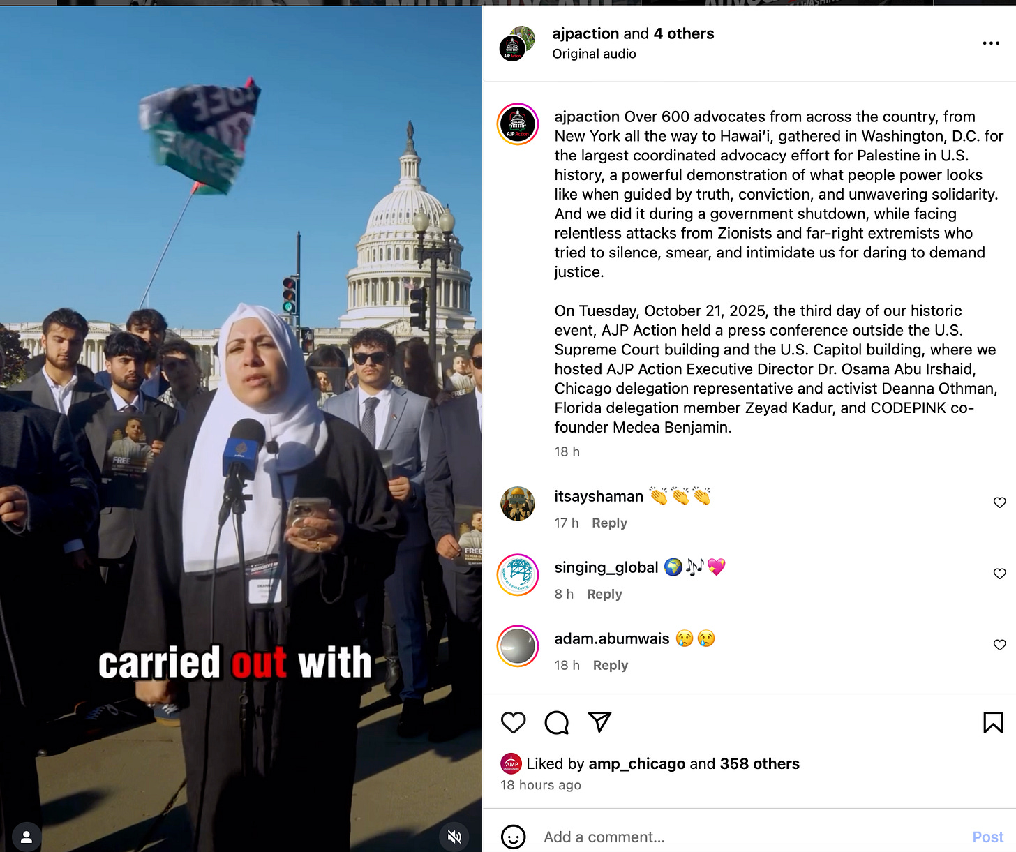 The panel is moderated by the chair of AMP-Chicago, Nida Sahouri. Sahouri has a long history of anti-Israel activism, including vocal support for Rasmea Odeh, a member of the Popular Front for the Liberation of Palestine and the orchestrator of a bombing that killed two U.S. citizens.
