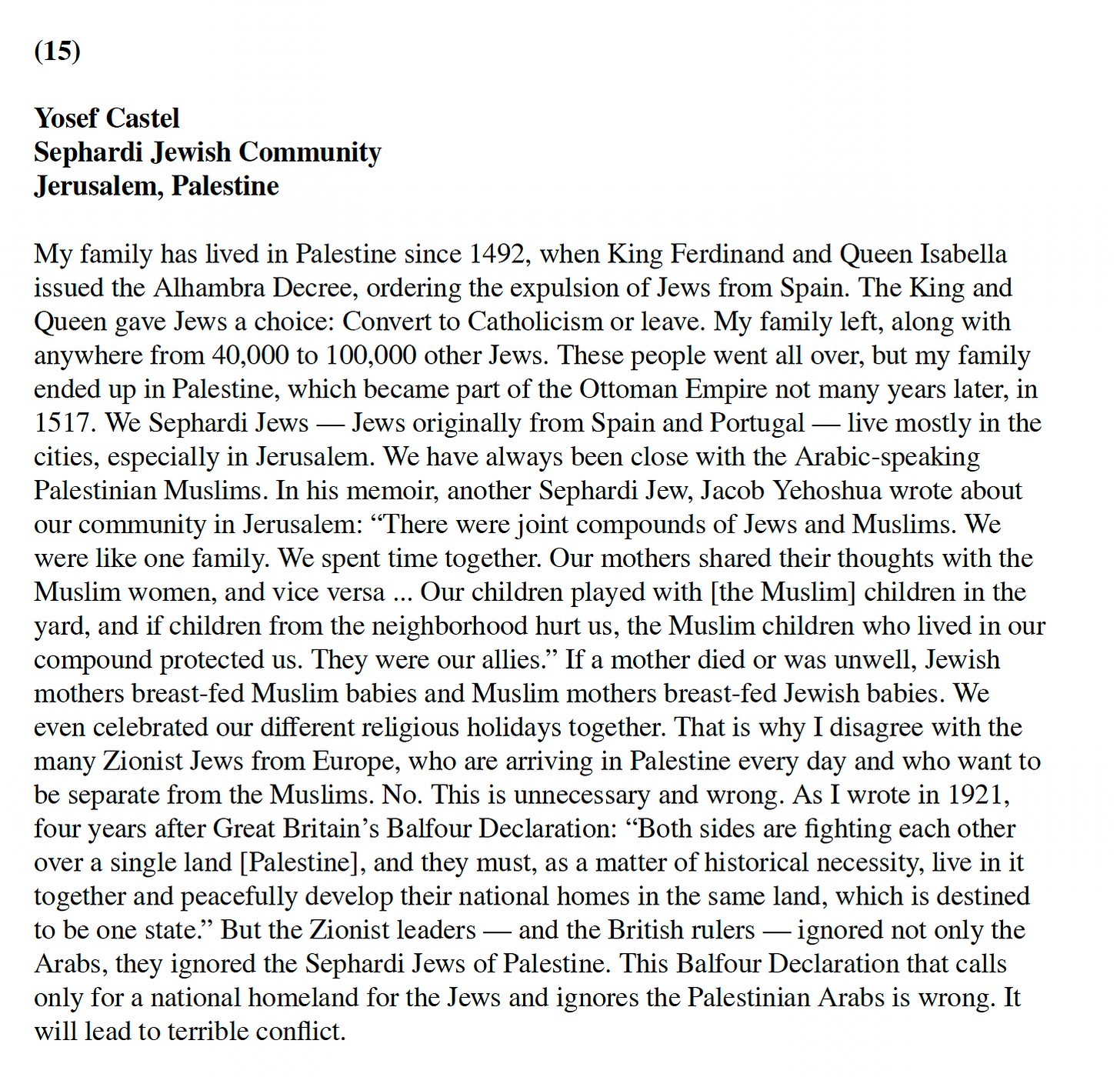 In the mixer, students “become” individuals to bring this history, and more, to life. Note that they do not act anything out. They try to internalize their roles to represent to one another their characters’ experiences, opinions, and aspirations. There are 17 of them. Here is a summary. The Zionists and pro-Zionists include: Theodor Herzl, Viennese “founding father” and theoretician of Zionism; Arthur Ruppin, director of the Palestine office of the Zionist Organization, and a purchaser of land for Zionist settlement in Palestine; Joseph Baratz, Zionist settler, who fled pogroms in Russia as a teenager as part of the Second Aliyah (migration) of Jews to Palestine, and worked there in one of the first kibbutzim; Lord Arthur Balfour, the British foreign secretary, who issued the fateful Balfour Declaration, announcing British Empire support for a Jewish homeland in Palestine; President Woodrow Wilson, supporter of the Balfour Declaration and the Zionist movement; and Herbert Louis Samuel, British High Commissioner for Palestine during the early years of the British Mandate period. Two Jews in the mixer are anti-Zionists: the Sephardic Jew, Yosef Castel, whose family had lived in harmony with Arab Christians and Muslims in Palestine since Jews were expelled from Spain in 1492; and Pati Kremer, a member of the socialist Jewish Bund, which sought to transform rather than flee eastern Europe, and saw Zionism as divisive and numb to the exploitation of working-class Jews by capitalist Jews.