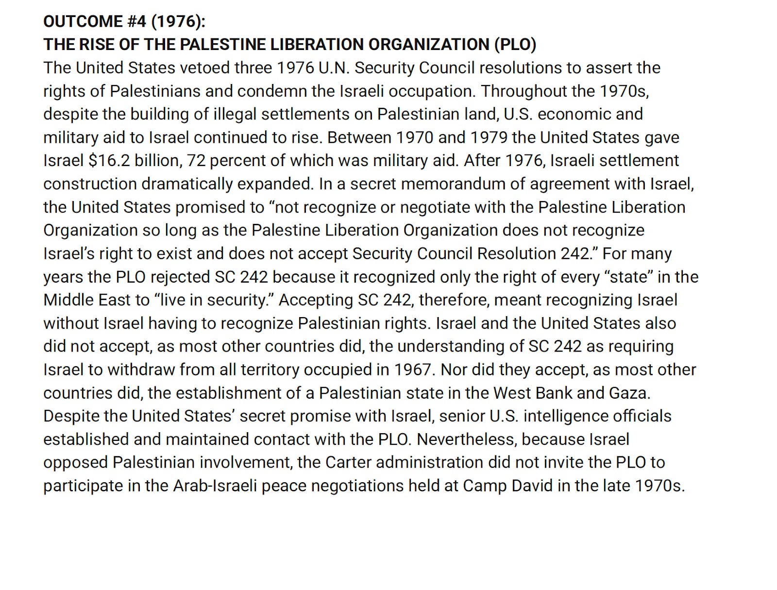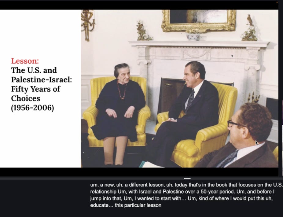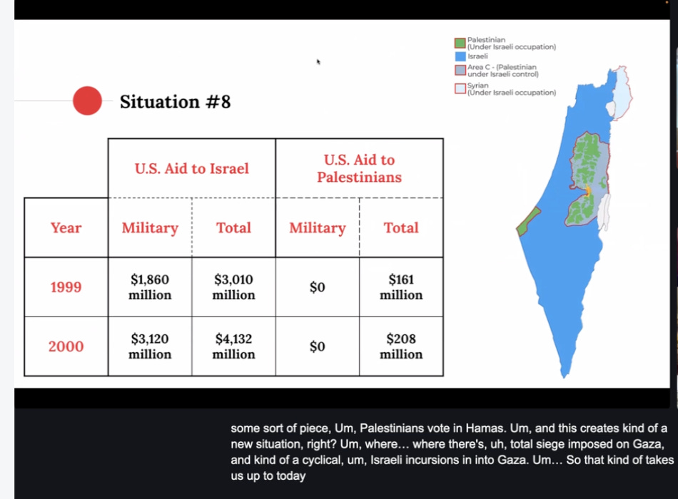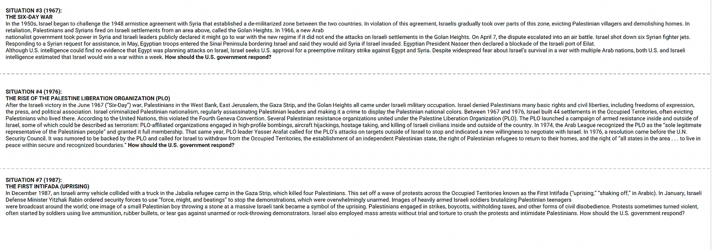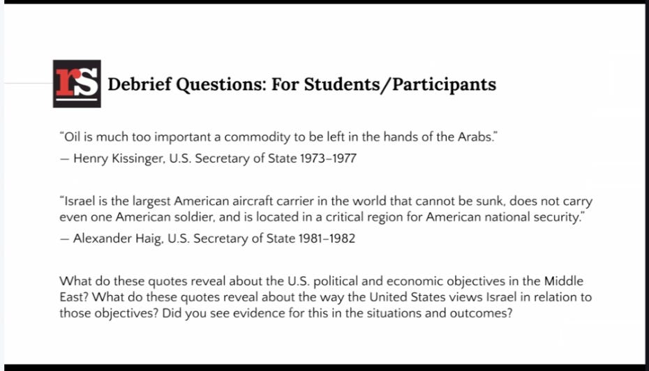 And so I wanted to create a lesson that would take students from post 1948 to relatively recently, like past the Oslo process and to this ends with the kind of rise of Hamas and Hamas winning the elections in Gaza in the early 2000s. And the US reaction to that. So part of the reason I created this was to kind of span a large portion of history in a relatively short amount of time. The other reason was because we really wanted a lesson on the US’ role in all of this, right?