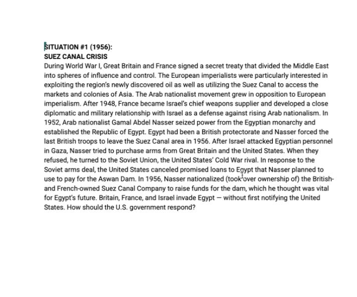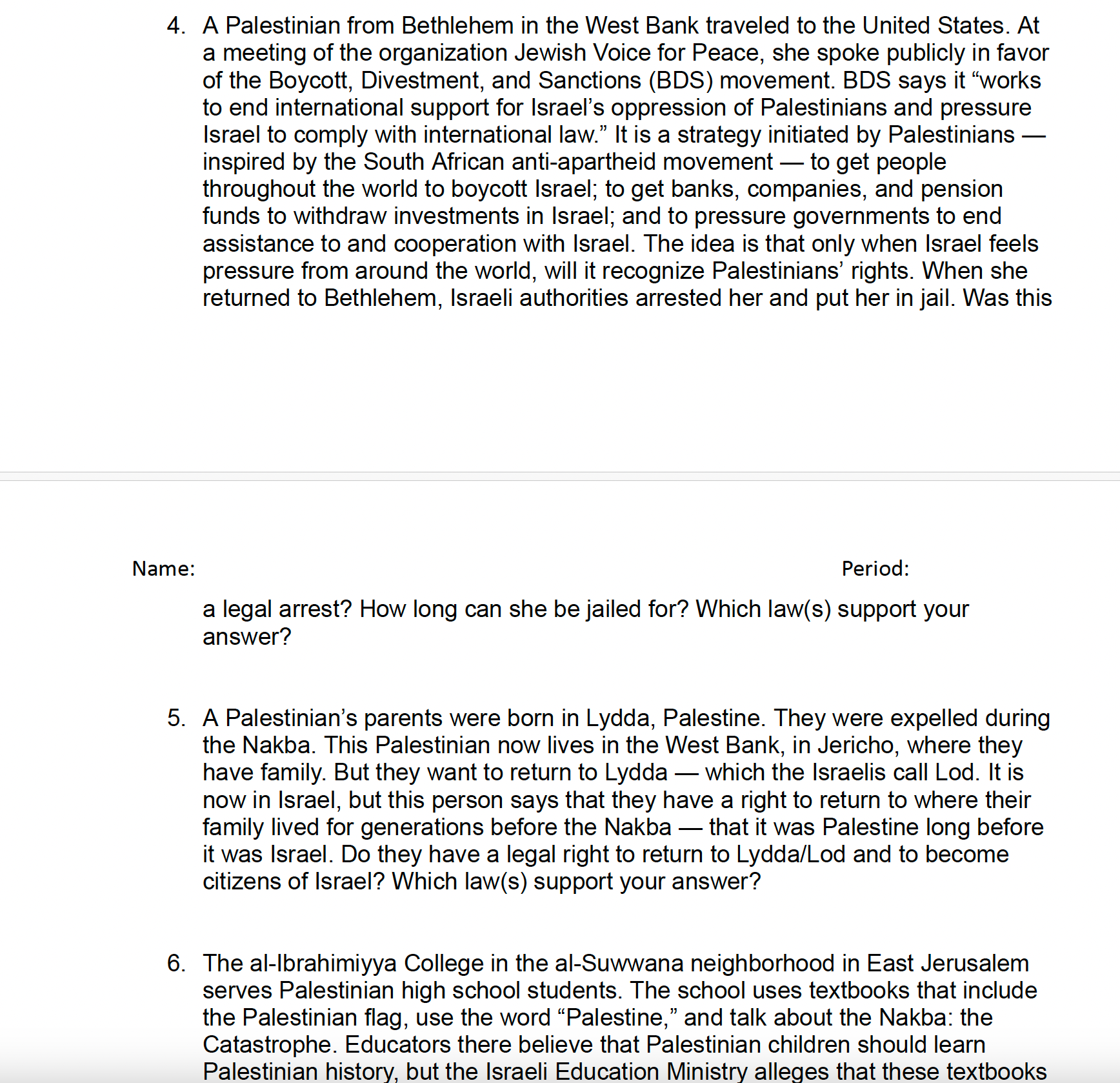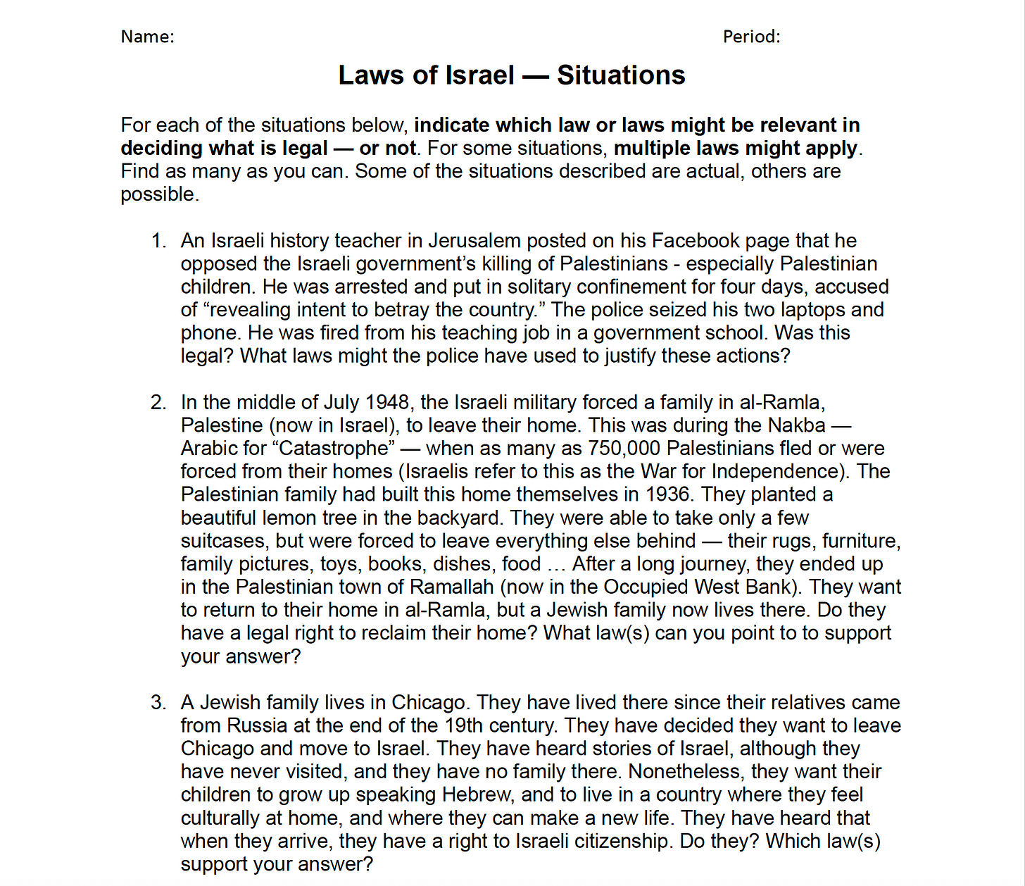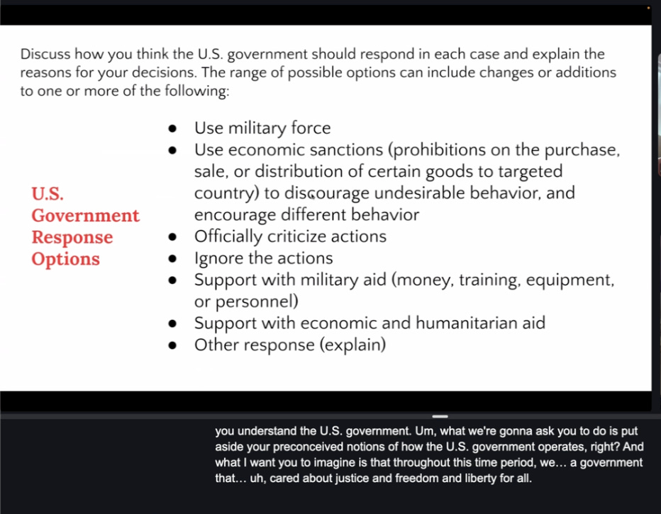 What we’re going to ask you to do is put aside your preconceived notions of how the US government operates. And what I want you to imagine is that throughout this time period, we a government that cared about justice and freedom and liberty for all, right, what we say we care about, but that we actually did. And so what I want you to do is, what I’m going to give you is in your groups, you’re going to look at different scenarios that happen over this time period in Palestine, Israel, and you’re going to have to imagine if the US government is a government that cares about justice, liberty, equality for everyone, how would it respond in this moment?