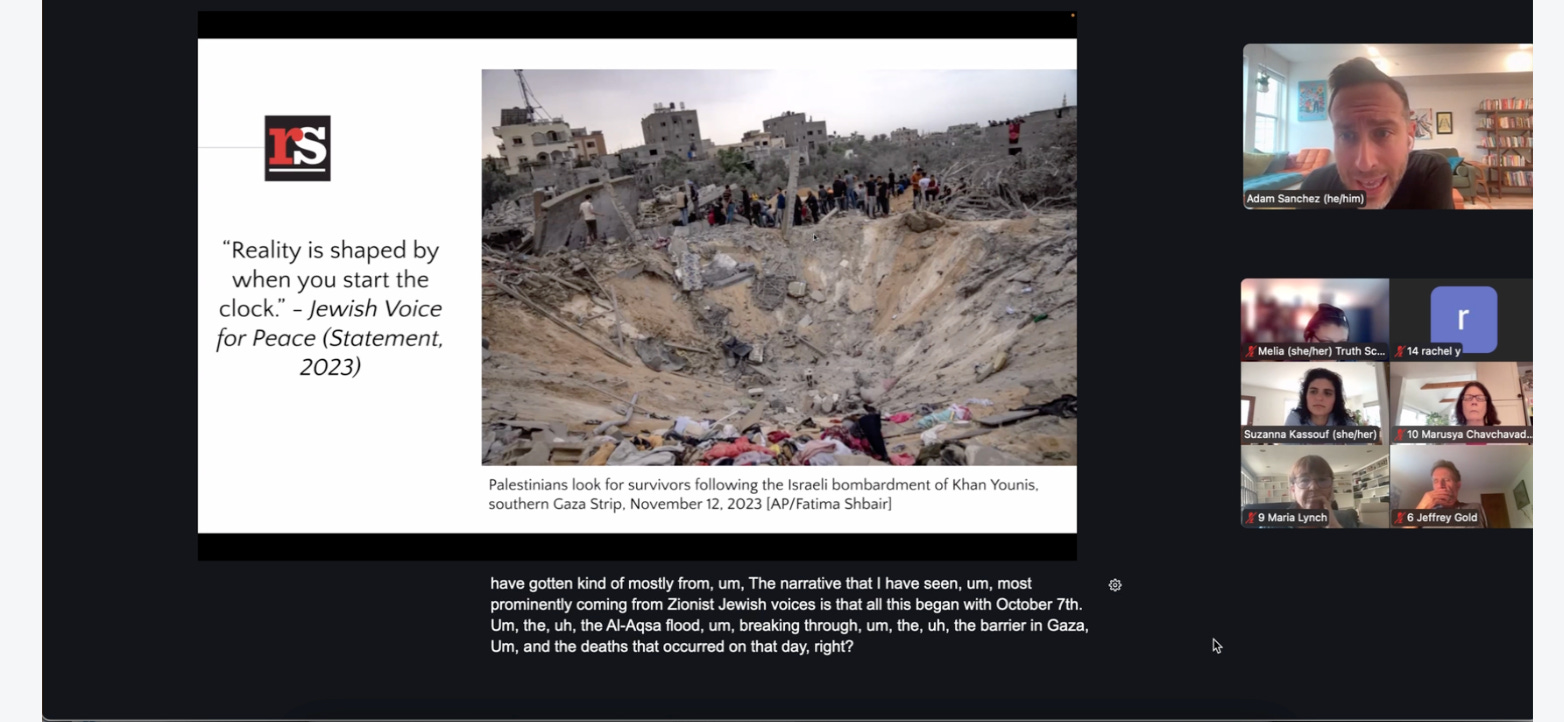 The workshop begins with an introduction by Sanchez and Kassouf. Sanchez discusses the “livestreamed genocide” which motivates these workshops. In his opening remarks, Sanchez says that “Zionist Jewish voices” say that “all this began with October 7th, the Al Aqsa Flood, breaking through the barrier in Gaza and the deaths that occurred on that day. And that is a narrative that really has taken hold in western media. 1200 were killed that day, 251 hostages. That is the emphasis of where to begin the clock. And we really wanted to start with this Jewish Voice for Peace statement that talks about how reality is shaped by when you start the clock.”