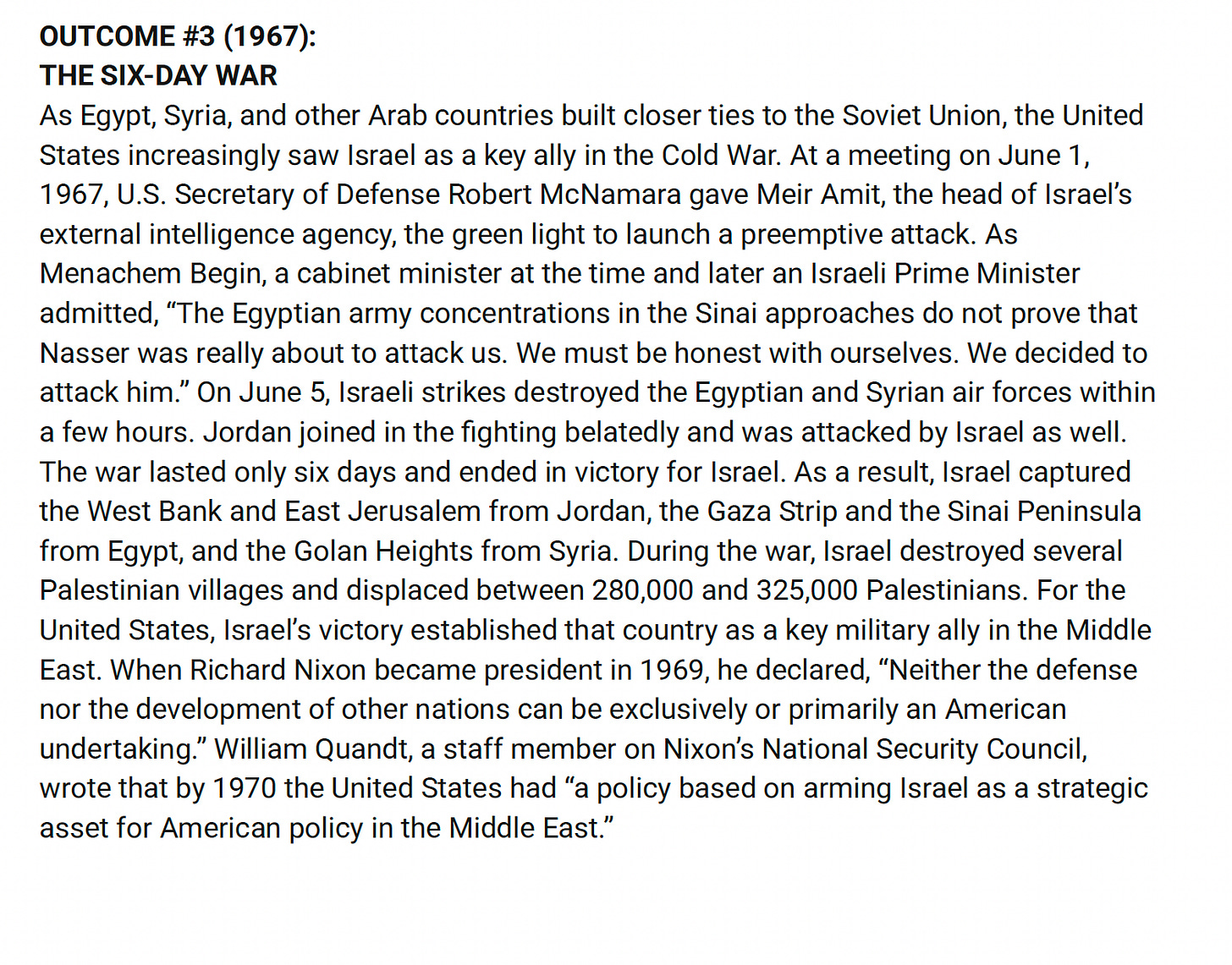 …And this is very different from how it was covered in the US media, and I think that’s a really important point to understand that in the US media, it was covered like this David and Goliath story, all these Arab countries are attacking Israel, and Israel is defending itself. And so the Jewish community really closed ranked in this moment. And you had, before this, you had a much larger non Zionist, anti-Zionist liberal Jewish community that then moved in line with the more hardcore Zionists in the Anti-Defamation League and other organizations like that. Partially because of the way the Western media portrayed this, it did not let the US intelligence reports or the Israeli intelligence reports, those were not public knowledge at this point… And you can see this in the slides that right after we again begin to ramp up our military aid to Israel right after the 1967 war, and this continues throughout the 1970s.