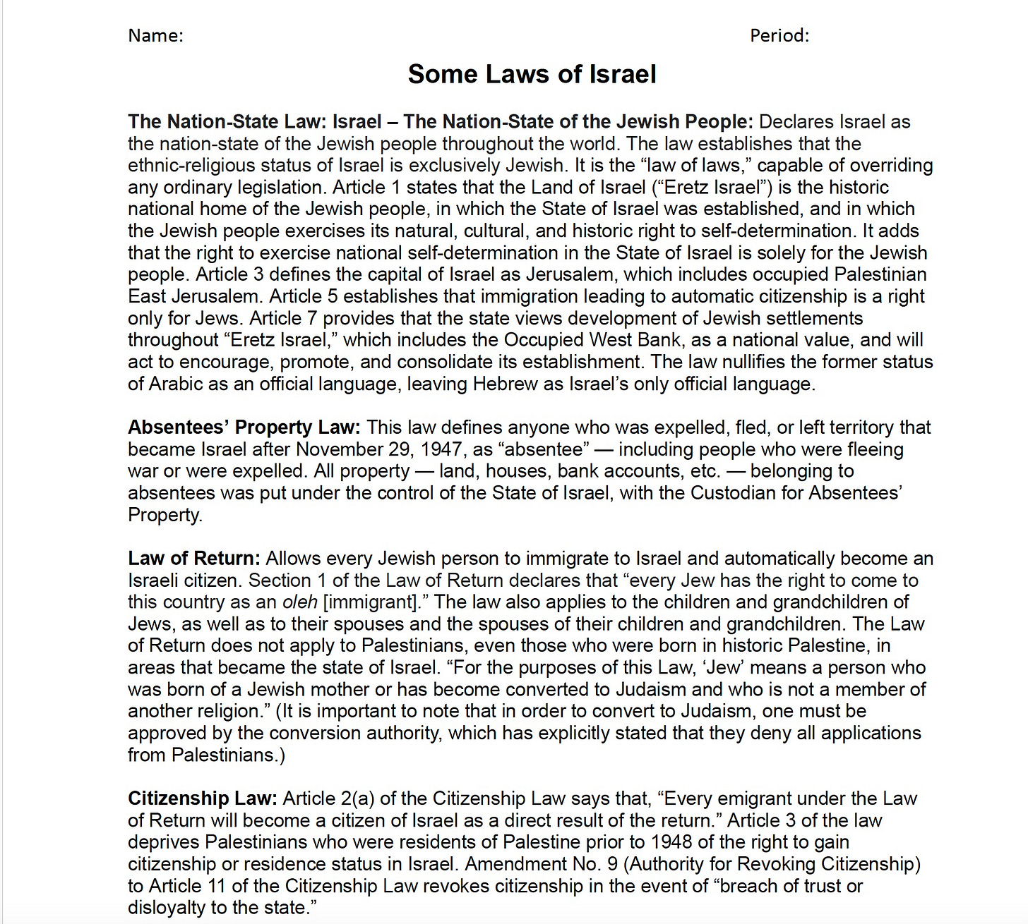 So obviously the book has, we’ve really only scratched the surface of what’s in the book and it’s got lessons we started with some of the more kind of historical lessons that focus on before 1948 and 1948 obviously is a key year to understand. Then we talked about the US role and kind of looking at the 50 years and how that role has changed over time. And then there’s also lessons like this one that talk about these words that are often thrown about in left circles to describe Israel, “apartheid”, “settler colonialism”, these sort of things. So there’s another lesson in there on settler colonialism and really just getting kids to understand what are these terms and do you think, here are the laws, do you think this applies? Would you use this term? The settler colonialism lesson gives different examples of settler colonialism and actually asked students to come up with a term for it.