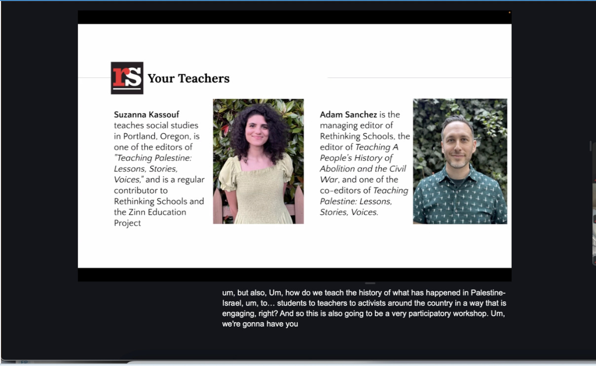 The K-12 Extremism Tracker has obtained screenshots and verified transcripts of a “Teaching Palestine” study group run by Rethinking Schools’ Adam Sanchez and Susanna Kassouf for an institution called the Sojourner Truth School For Social Change Leadership.