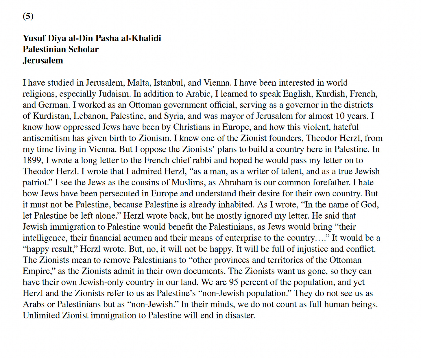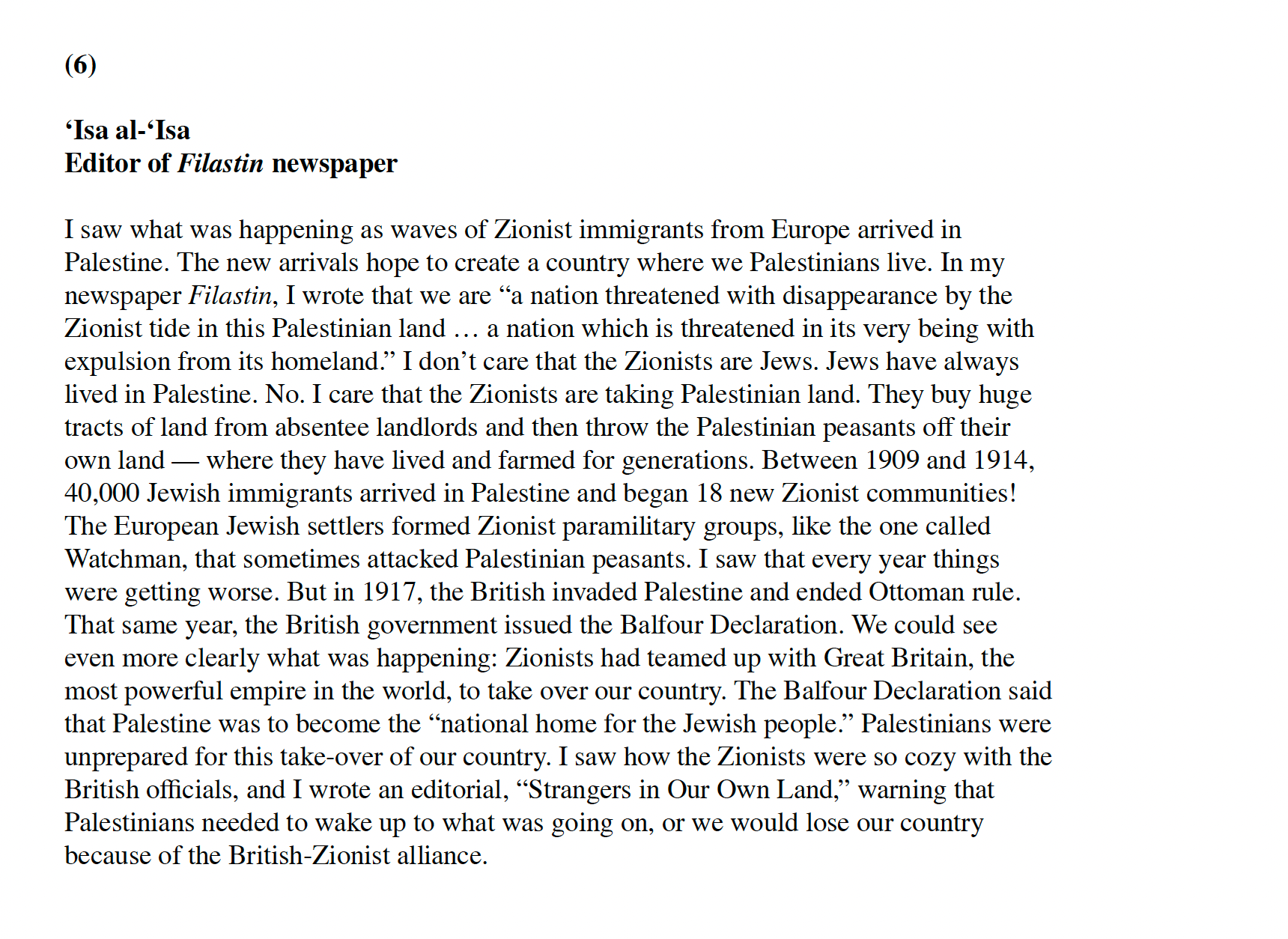 Scholars and journalists wrote defiantly about the waves of Zionist migration and the Zionists’ separatist vision for Palestine, which would turn Palestinians into “strangers in their own land”: Palestinian scholar Yusuf Diya al-Din Pasha al-Khalidi knew Theodor Herzl from his time in Vienna and wrote to him: “In the name of God, let Palestine be left alone”; Najib Nassar, the Christian publisher of the newspaper al-Karmil, wrote about Zionist land purchases and Palestinian expulsions; ‘Isa-al-‘Isa, editor of Filastin, wrote critically about the Balfour Declaration and the British-Zionist partnership during the early years of the British Mandate; and Musa Kazim al-Husayni, a leader with the Palestine Arab Congress organized against the discriminatory nature of the British Mandate in the years after the Great War. And finally, there is Elias Sursuq, one of a number of absentee landlords who took advantage of an 1858 Ottoman law to claim ownership of huge tracts of land in Palestine and later sold that land to Zionists, who were committed to empty the land of Palestinians.