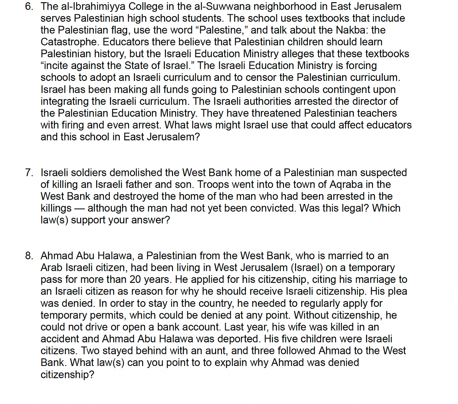 Kassouf says she has spent time trying to consider the “counterpoints” to the Palestinian narrative because she has Jewish students in her class. Still, she says, she can find no justifications. Kassouf has taught “Israeli Apartheid: A Simulation.” to her students and shown them this video in her class: