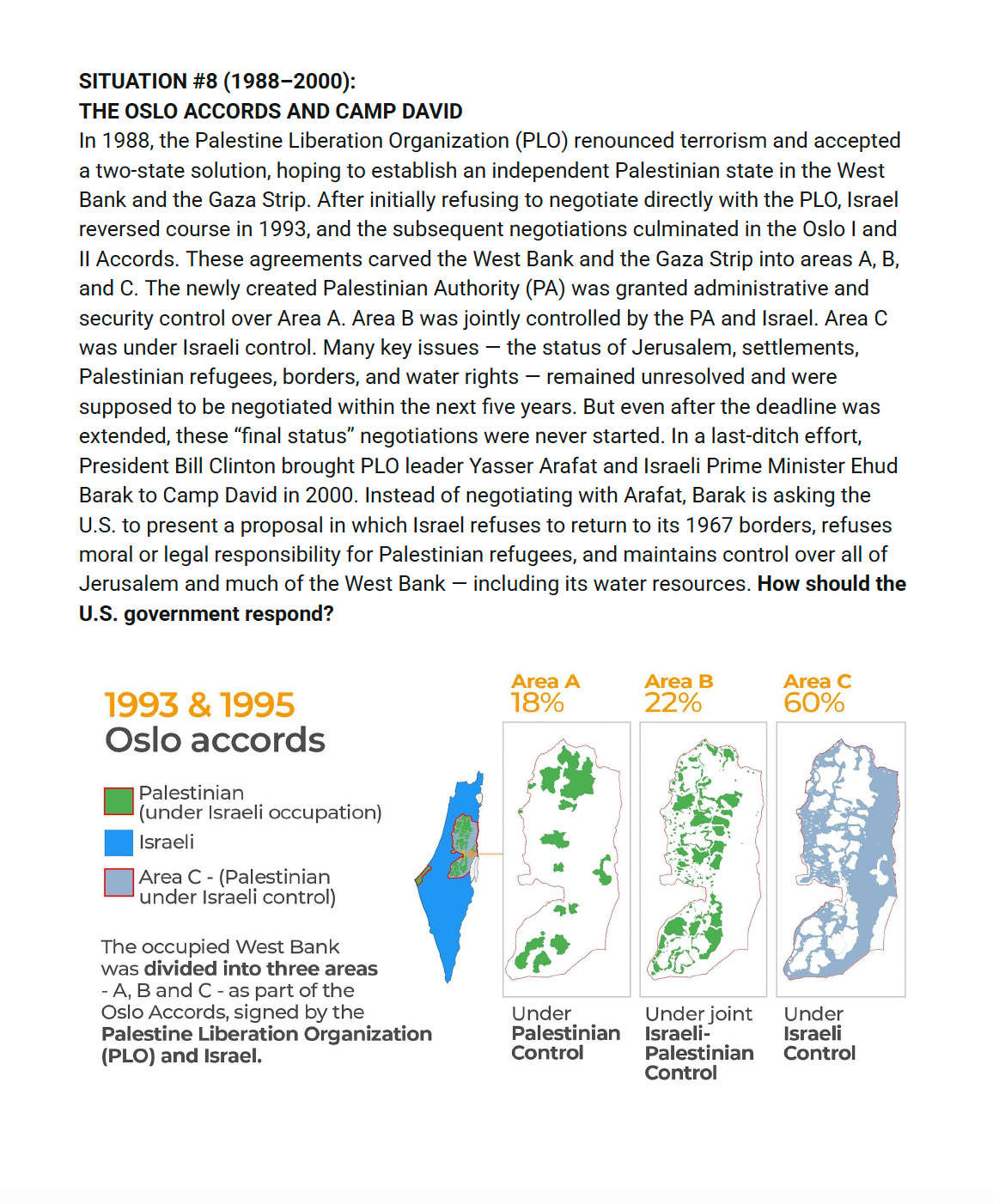 For the sake of time, what I’m going to do is I’m going to skip us ahead. I mean, the response, I think I’ll just say briefly in situation number seven is somewhat interesting because you actually have the Reagan administration issuing a public condemnation for Israel, Israel’s harsh security measures and excessive use of live ammunition. You also have George H W Bush’s even firmer stance with Israel. He delayed 10 billion in loan guarantees, of course, compared to the millions and millions of dollars we’re still giving Israel in military aid. These are relatively minor things that Reagan and George HW Bush did. But I think it shows that even in the eighties in the nineties, there is still, even though Israel has of course become a key ally in the United States, there is still somewhat of a willingness to try and play both sides for the American public. This begins to change with Oslo, but really drastically changes when the US launches the war on terror in 2001 and begins to see the United States and Israel both as these victims of Islamic terrorism and that the Palestinians are, because of Palestinian racism, are kind of seen in the US and Israel as part of this, the Islamic terror. But we’re going to jump ahead to the Oslo Accords and Camp David, because I think this is really the another key moment to understand where we’re at today.
