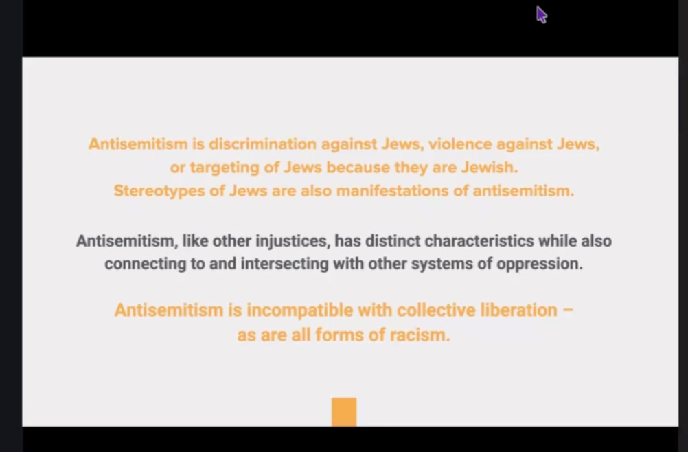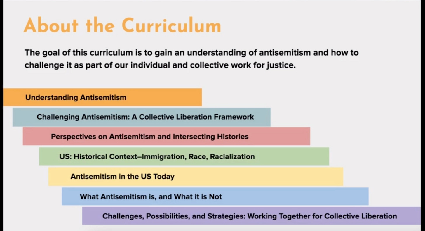 The curriculum and our workshop tonight opens with some basic understandings of what antisemitism is and what follows is some historical context of Jewish experience and antisemitism. From there, the focus is on antisemitism in the United States historically and currently, as well as the ways antisemitism is misused to serve an anti-liberatory political agenda. In order to understand what antisemitism is, it is also important to know what it is not. And then the curriculum moves to an exploration of fighting antisemitism as part of a broader commitment to liberation and why we must resist the exceptionalization of antisemitism from how we understand who is entitled or who has the right to speak about antisemitism to the ways that isolating it from other struggles is harmful to our work for justice.