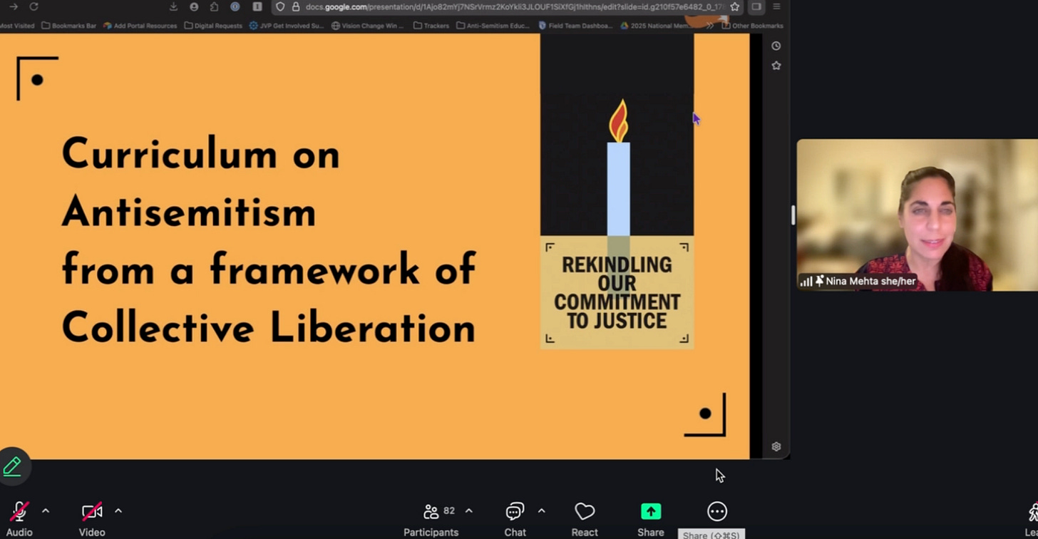And to share a bit of a background of how and why our curriculum on antisemitism from a framework of collective liberation has evolved at this moment. So this curriculum we created grew out of many requests and conversations with educators and with our longtime partners in social justice organizations, including JVP. And our movement partners articulated a need for workshops that addressed antisemitism from a collective liberation lens, and that made clear what antisemitism was and what it wasn’t, including disrupting the dangerous framing of anti-Zionism and criticism of Israel as antisemitism (emphasis added).