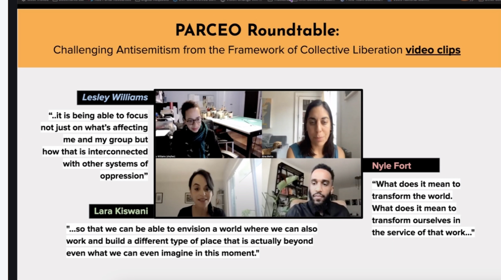 The discussion moves to the need to understand and challenge antisemitism from “ a framework of collective liberation.” Mehta shares a brief clip of a roundtable held with Jewish Voice for Peace activist, Lesley Williams, Executive Director of Arab Resource and Organizing Center, Lara Kiswani, and Columbia Professor Nyle Fort. This roundtable was part of the process of developing PARCEO’s antisemitism curriculum.