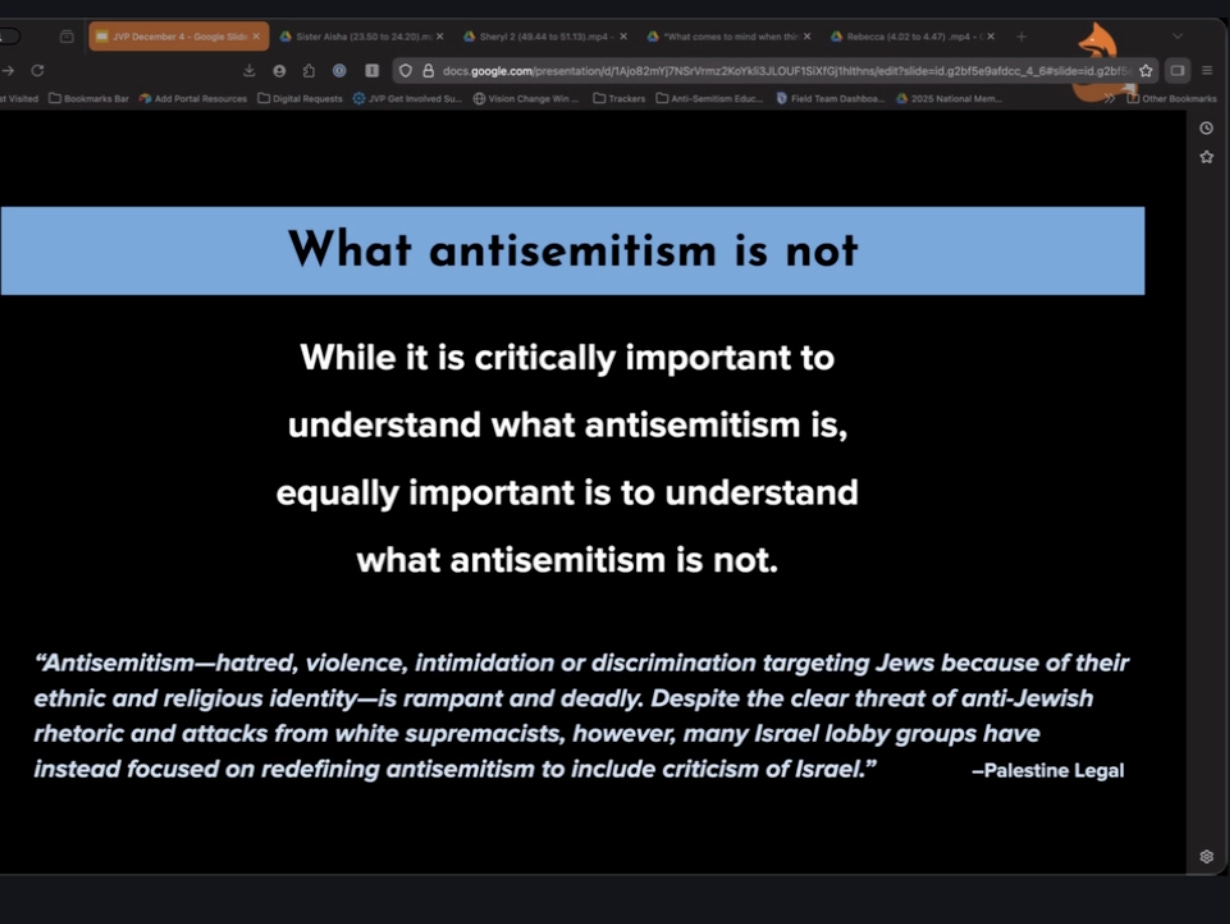 …there have been changing needs and realities that we’ve responded to as we facilitate the curriculum. And for many the International Holocaust Remembrance Alliance working definition on antisemitism or the IHRA was something that had not really been on people’s consciousness when we first started our workshops. But in the past couple of years, for those of us in the Palestine solidarity community, it is unfortunately a household word. We know too well that IHRA is not designed to clarify what antisemitism is, but rather to conflate antisemitism with criticism of Israel or Zionism. The IHRA definition includes 11 examples of antisemitism, seven of which specifically focus on the state of Israel and not on Jews. Currently, IHRA is becoming a legal benchmark for defining antisemitism and has been adopted by universities and pushed in many ways by our administration. States and cities have also adopted a legislative definition of antisemitism while never proposing a definition of any other form of racism.