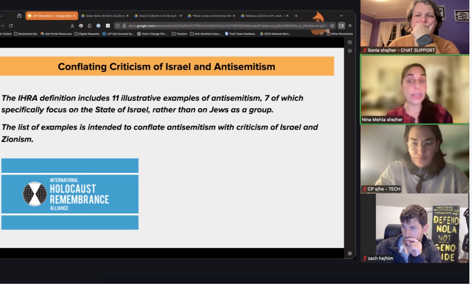 So our foundational framing has been rooted in a dynamic, interactive relationship with our movements and struggles for justice and the needs emerging from those relationships and from our work together. For example, with so many of our groups resisting the Anti-Defamation League’s dangerous curriculum and ideology in our schools, we’ve been brought in to facilitate more and more workshops with teachers and with students and are now developing lesson plans and resources for teachers to be able to have for their schools and for their classrooms, or for universities and organizations and labor and faith-based groups who are under attack or who have mandated antisemitism trainings or just don’t want to offer a different kind of workshop (emphasis added).