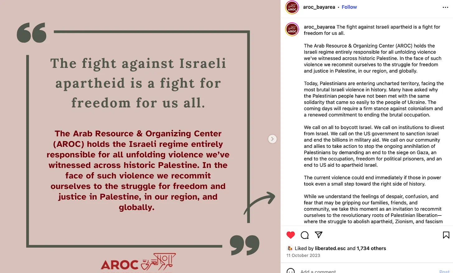 “The Arab Resource & Organizing Center (AROC) holds the Israeli regime entirely responsible for all unfolding violence we’ve witnessed across historic Palestine. In the face of such violence we recommit ourselves to the struggle for freedom and justice in Palestine, in our region, and globally.