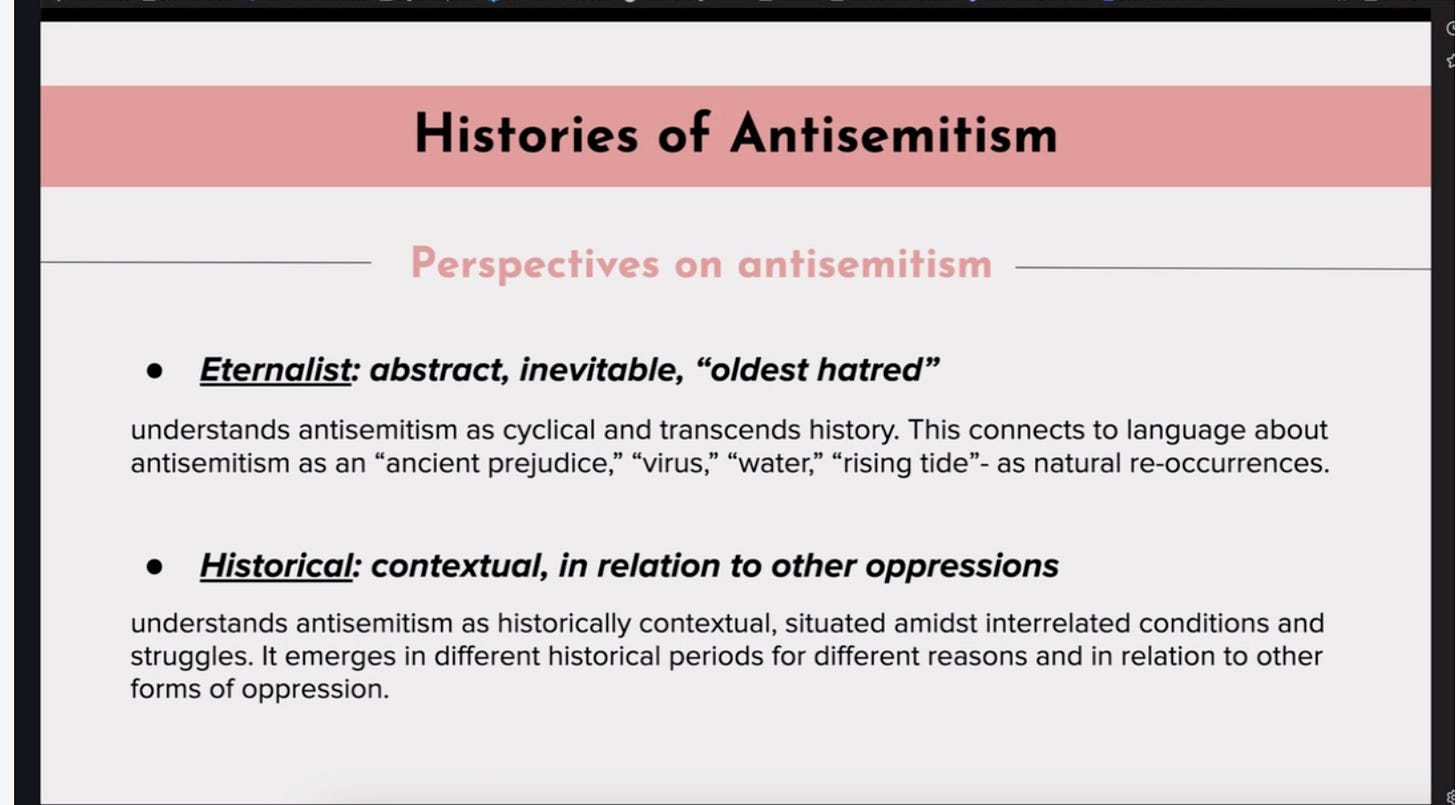There are two clearly distinct views of the history of antisemitism that impact how antisemitism is seen, felt, and experienced. One views antisemitism as eternal as a natural phenomenon. And in isolation from other forms of oppression, it puts forth that antisemitism is a given, it’s never ending, it can’t be understood, and it can’t be stopped. This perspective sees Jews as always under threat. It is us versus them. The other perspective, which is the one that we adhere to in this curriculum, understands antisemitism as historically contextual, situated amidst interrelated conditions and struggles. It emerges in different historical periods for different reasons and in relation to other forms of oppression. That is, when looking at Jewish experience, the complexity of Jewish life and the reality of antisemitism in different locations, context is critical. These different understandings not only impact how we see antisemitism, but also how we think about responding to it that is distinct from or as part of and connected to other struggles against oppression (emphasis added).