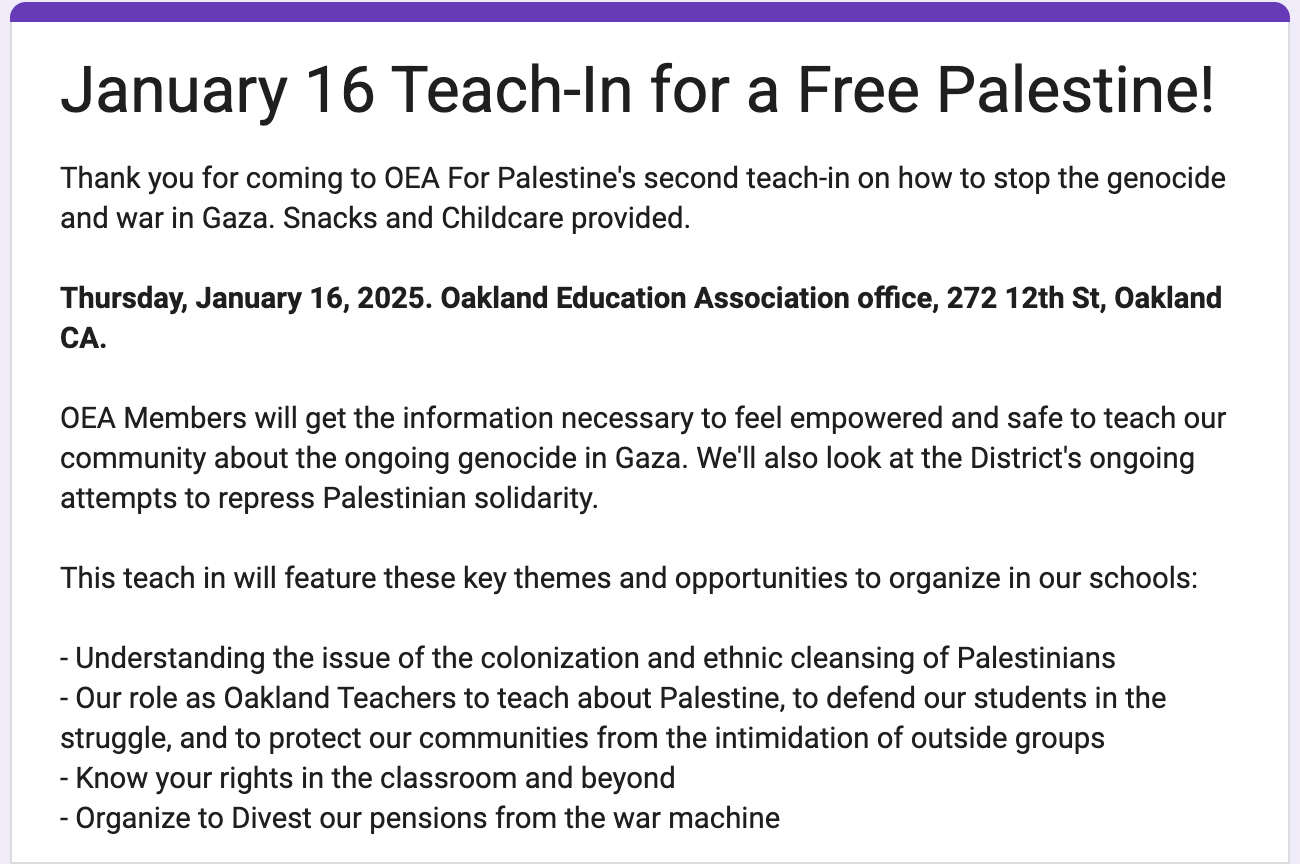 With the resolution to cut ties with the ADL, and this latest teach-in which accuses Israel of “colonization” and “ethnic cleansing” and which accuses the District of repressing “Palestinian solidarity” to be held at the OEA headquarters, the Oakland Education Association appears unwilling to play ball with the District’s attempts to assuage the CDE’s concerns.