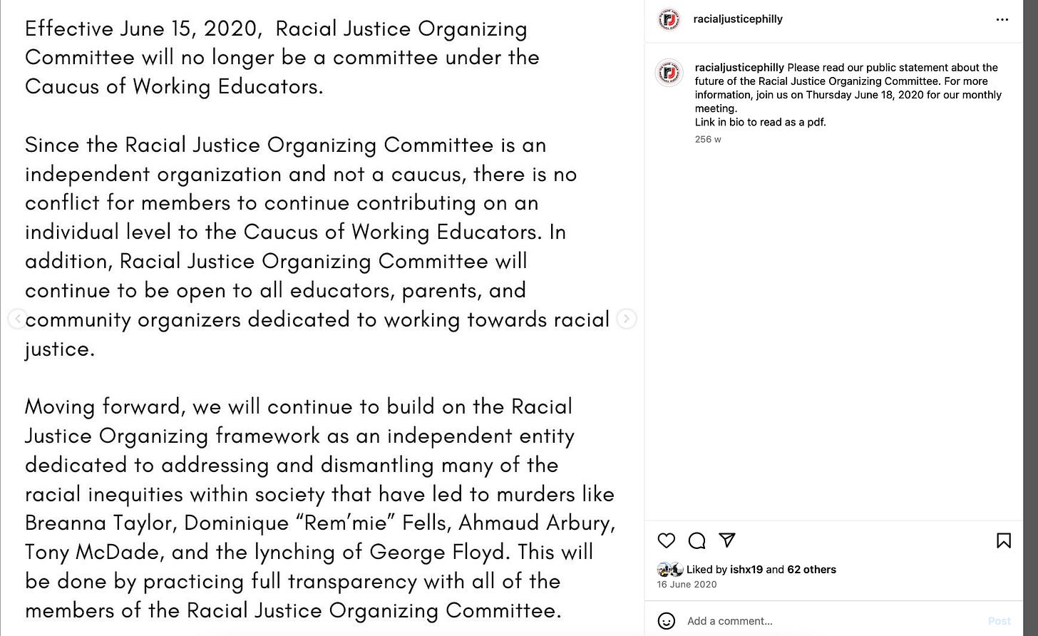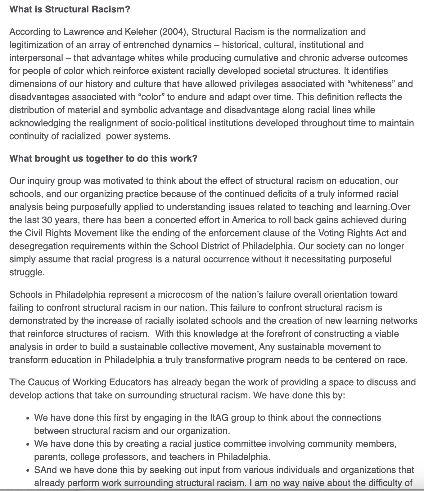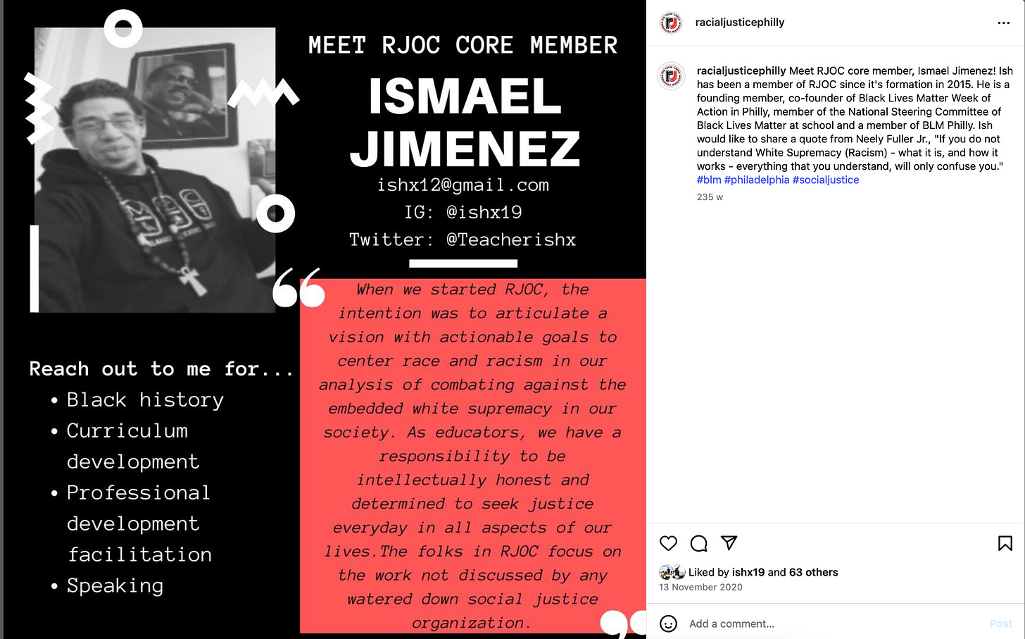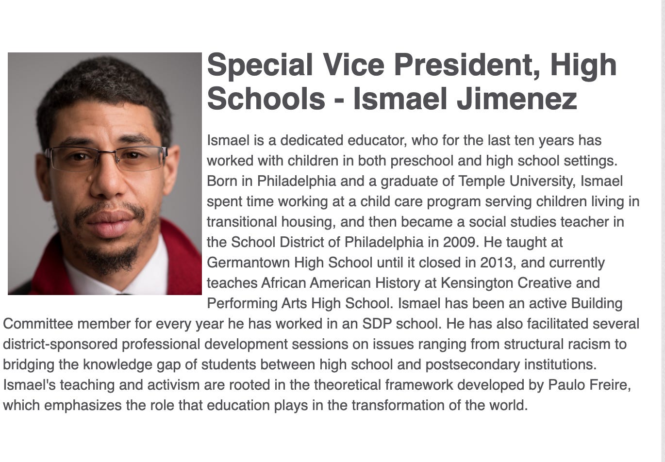 So, the CWE was formed in 2014. The Racial Justice Organizing Committee, with most of its founding members, decided in 2020 to become an independent organization - with a list of demands for Philly schools. In 2022, Ismael Jimenez, a founding member of CWE and the RJOC becomes the Director of Social Studies Curriculum for the entire district. An interesting hiring decision indeed.