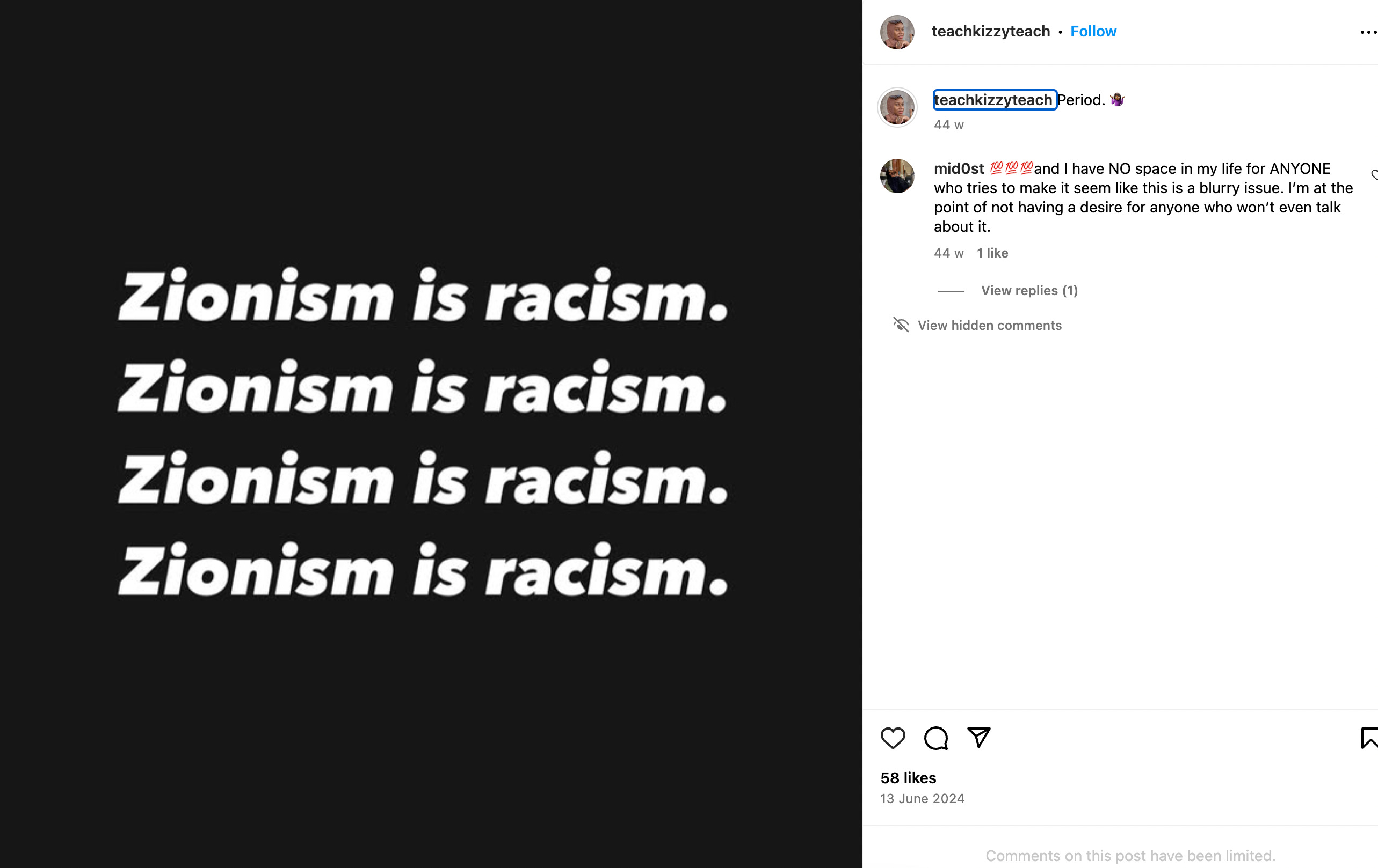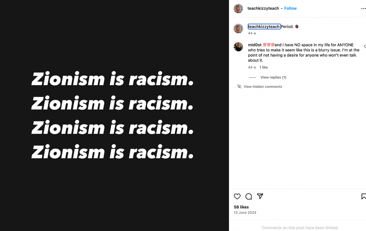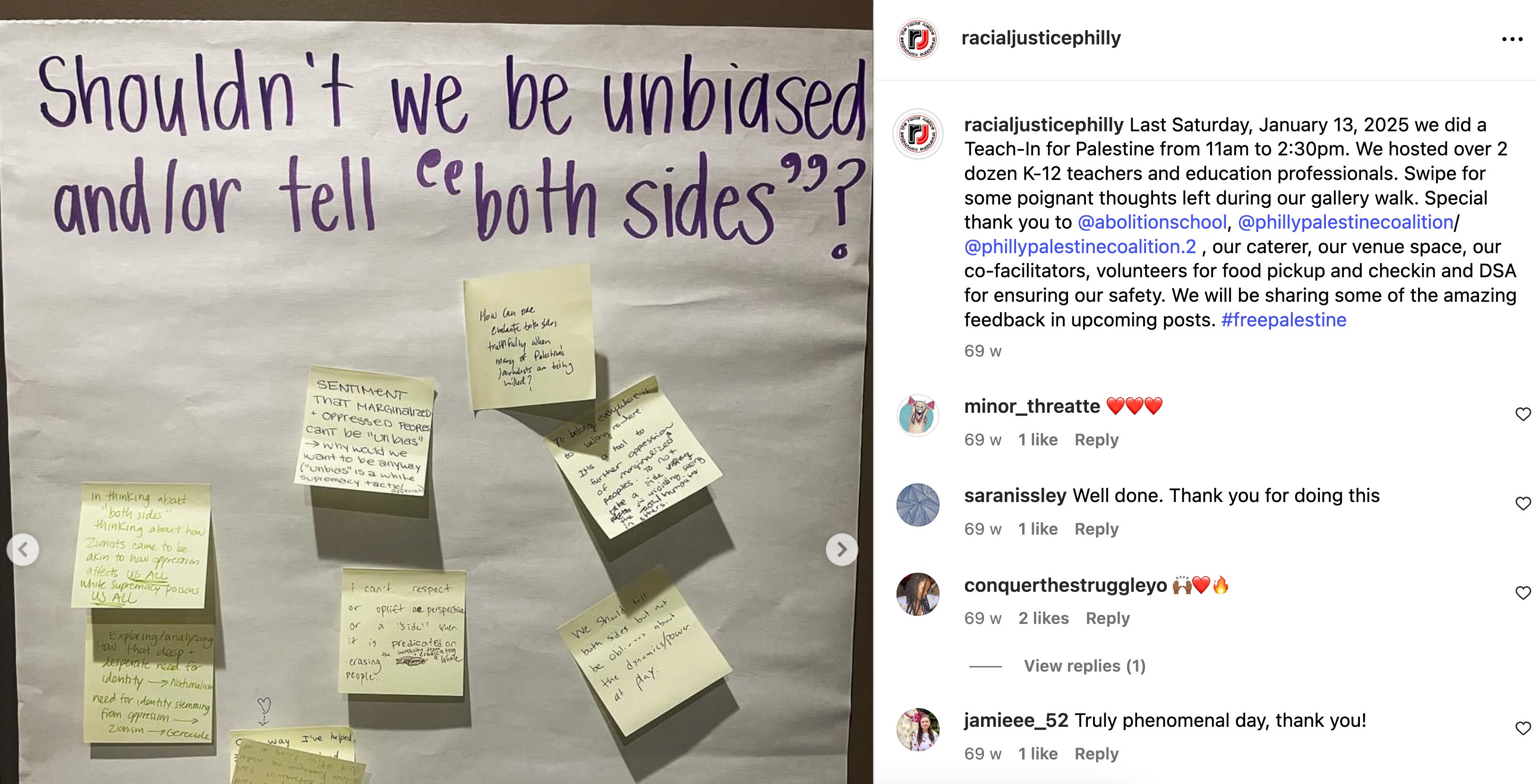 In this “Teach-In for Palestine” for K-12 teachers, RJOC teaches that presenting “both sides” in the classroom is wrong. Being “unbiased” is a tactic of white supremacy.