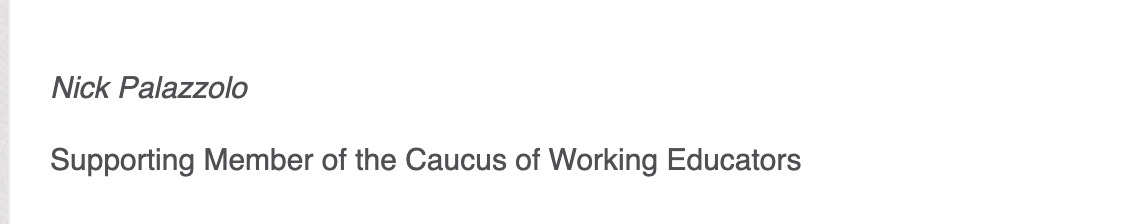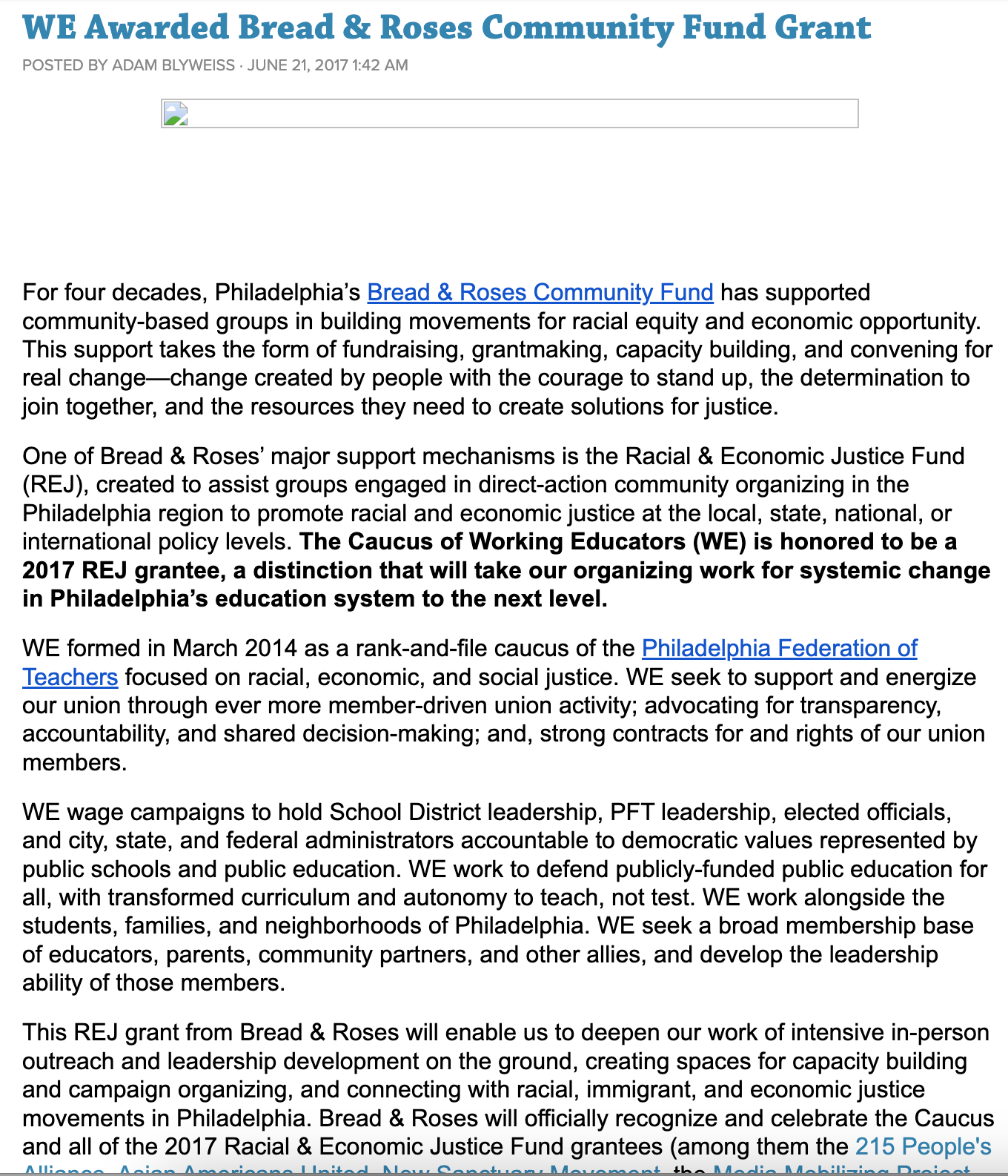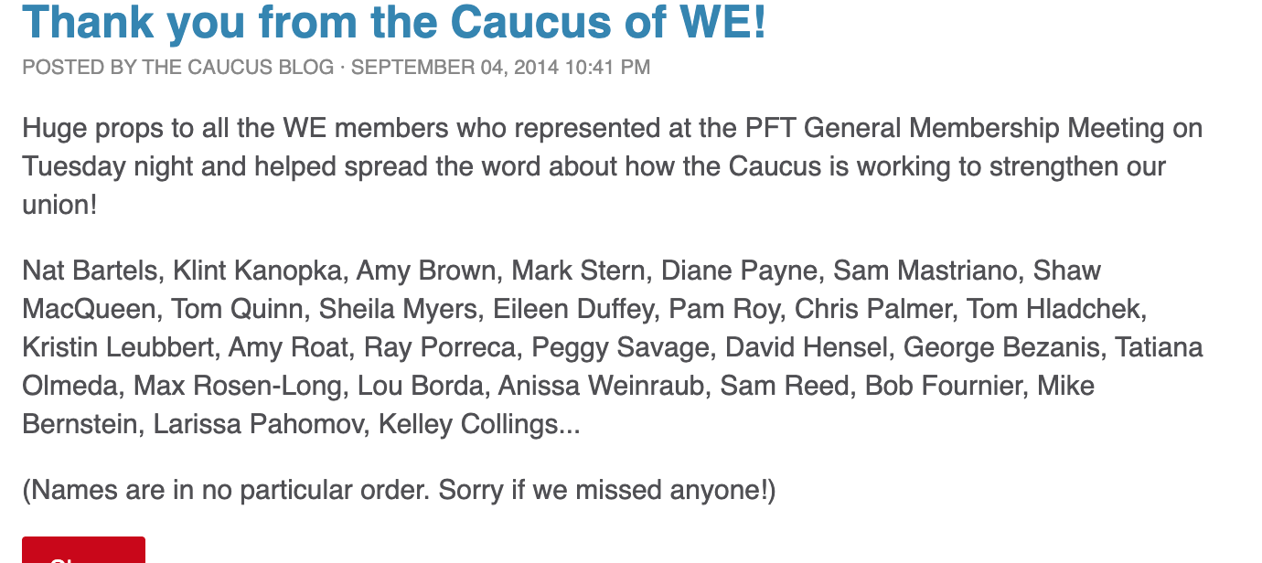 Like the Educators for a Democratic Union with the Massachusetts Teachers Association (EDU members have consistently been voted president and vice president of MTA since its inception), CORE within the Chicago Teachers Union (CORE members now lead the CTU), or the MORE Caucus within the United Federation of Teachers, the Caucus of Working Educators (CWE) was formed to influence a more progressive agenda within the PFT and perhaps even take leadership of the PFT as happened in Massachusetts and Chicago.