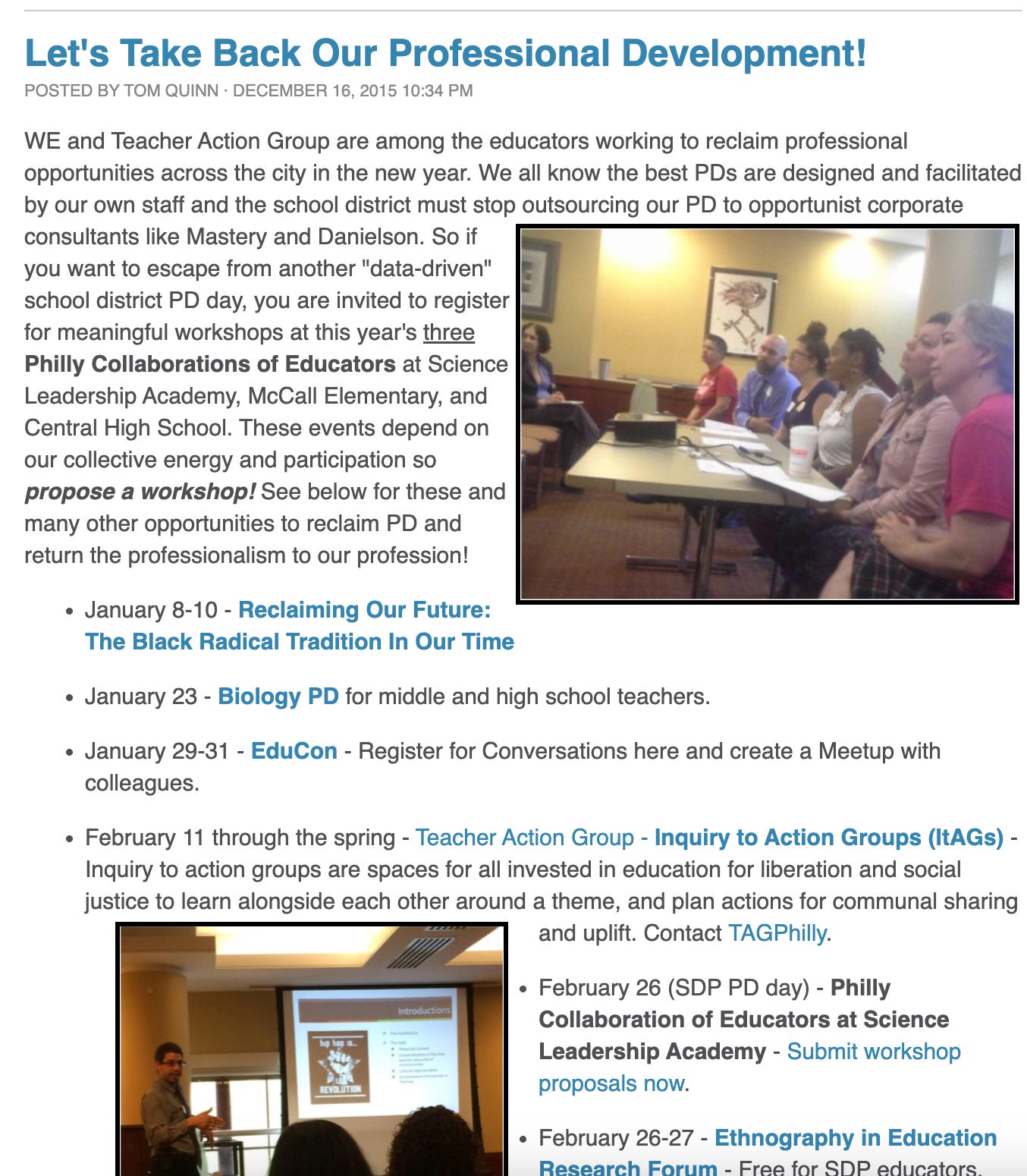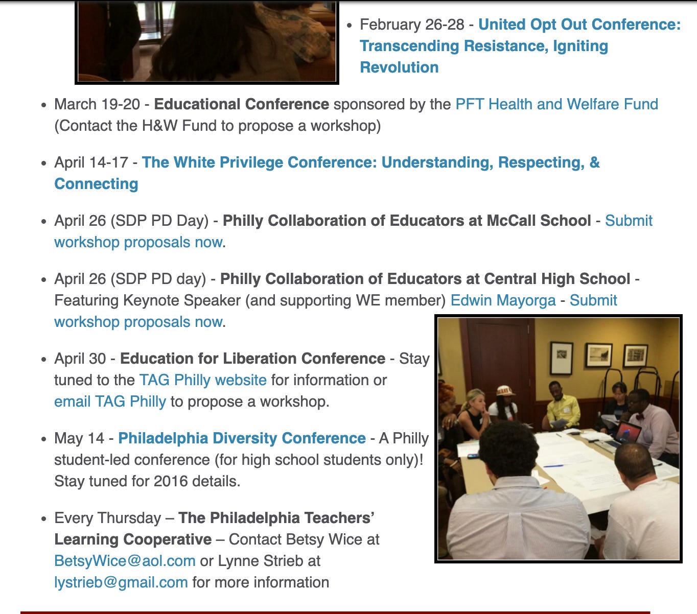 The CWE was concerned with offering professional development to Philly teachers: including “Reclaiming Our Future: The Black Radical Tradition in Our Time”, “United Opt Out Conference: Transcending Resistance, Igniting Revolution”, “The White Privilege Conference: Understanding, Respecting and Connecting” and the “Education for Liberation Conference.”