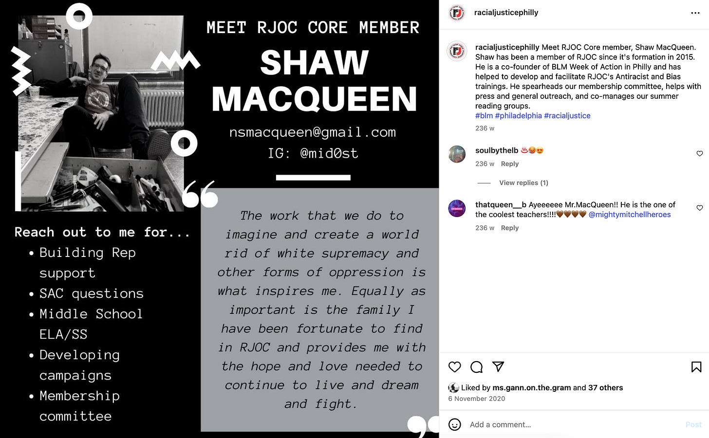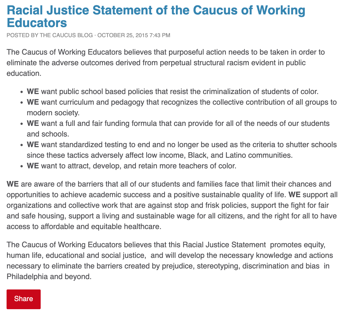 The RJOC began as a committee of the Caucus of Working Educators within the Philadelphia Federation of Teachers.
