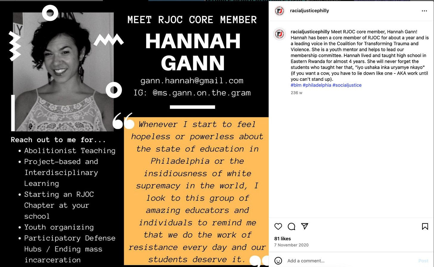 The Racial Justice Organizing Committee (RJOC) is an organization based in Philadelphia. Its core members include School District of Philadelphia teachers Keziah Ridgeway, Norman Shaw Macqueen and Hannah Gann as well as School District of Philadelphia Director of Social Studies Curriculum Ismael Jimenez.