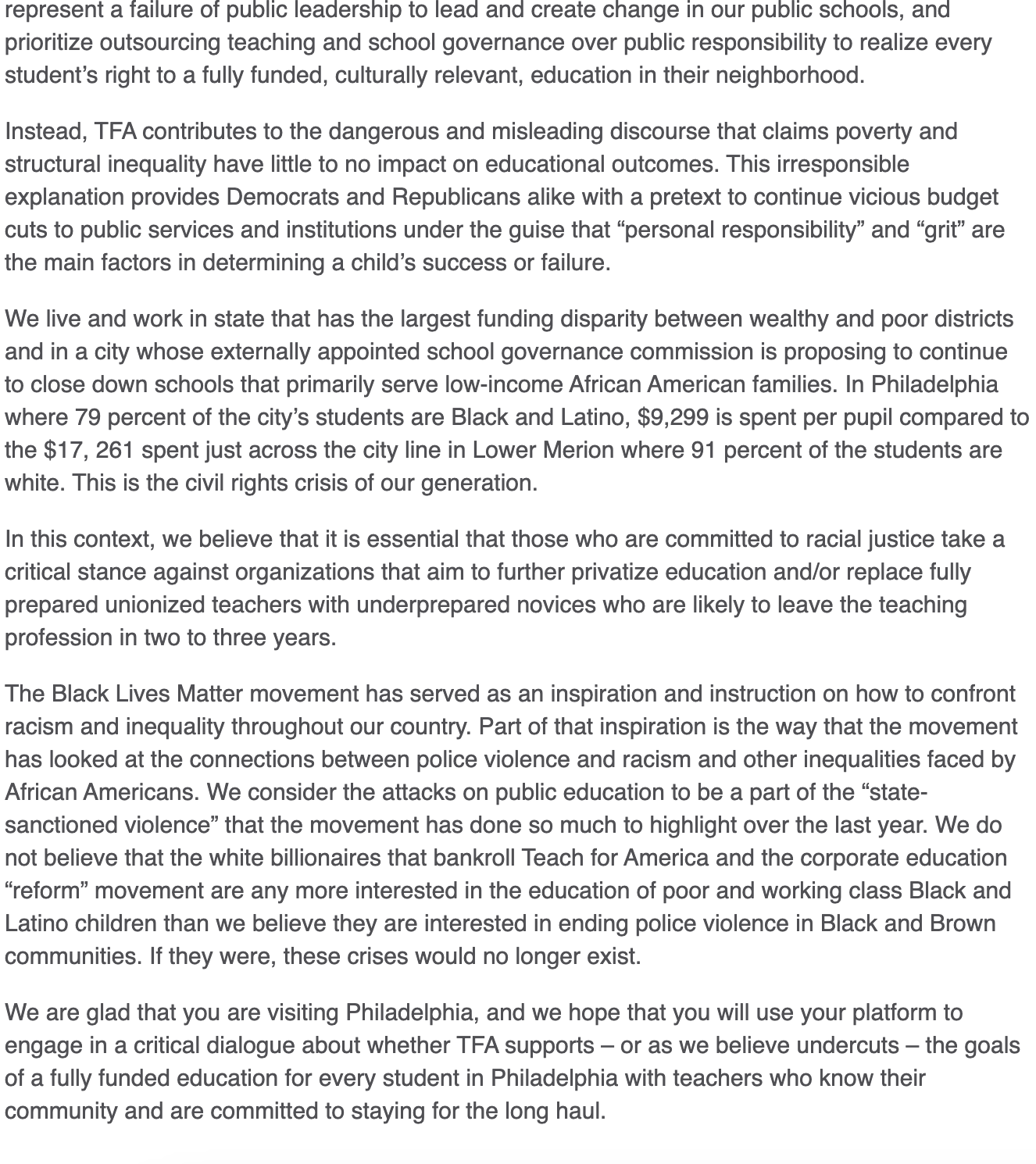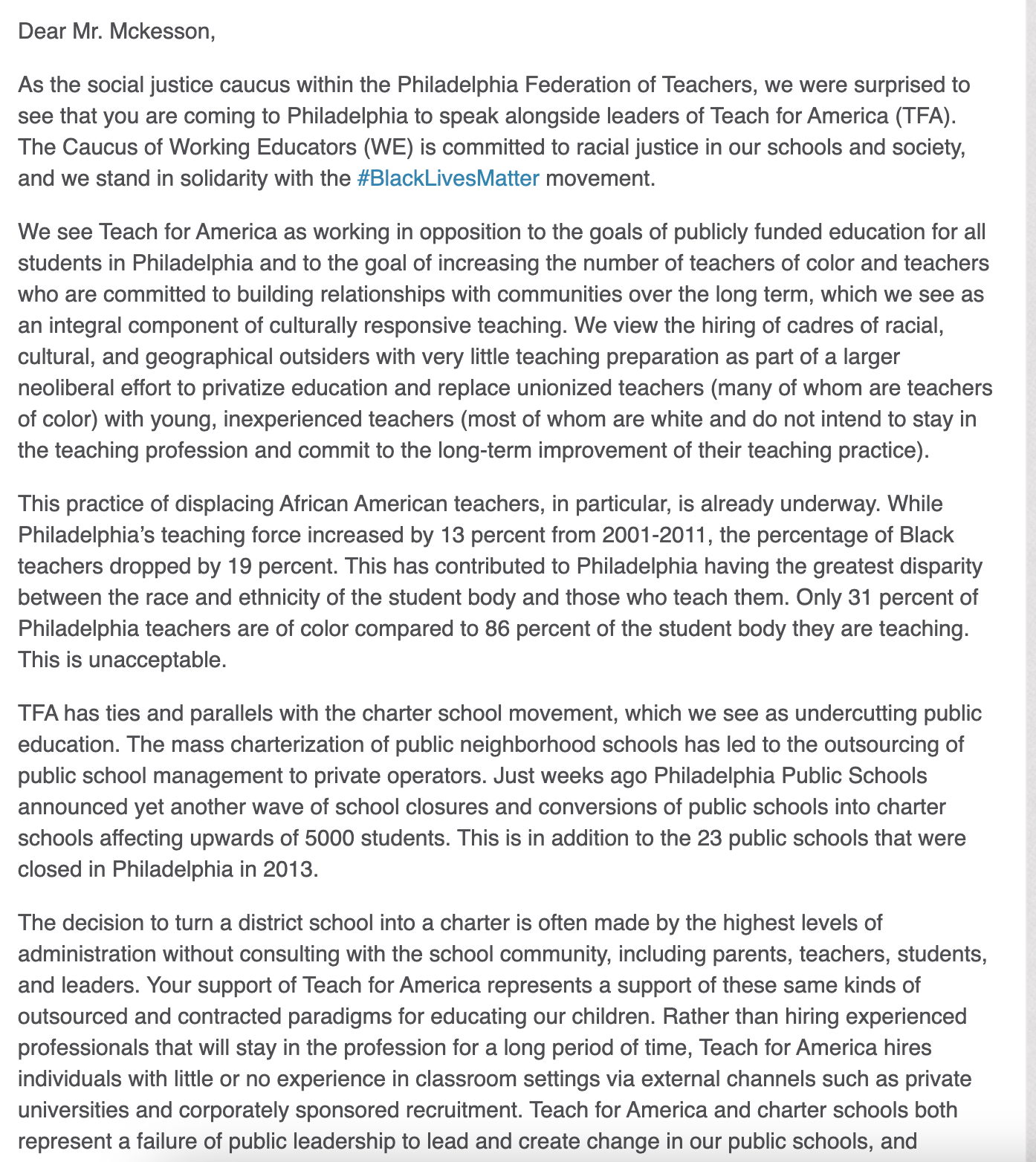 The CWE believes that Teach for America upholds white supremacy. As it says in a letter to Deray Mckesson, who is on the board of Teach for America, it sees TFA as “part of a larger neoliberal effort to privatize education and replace unionized teachers (many of whom are teachers of color) with young, inexperienced teachers(most of whom are white…).”