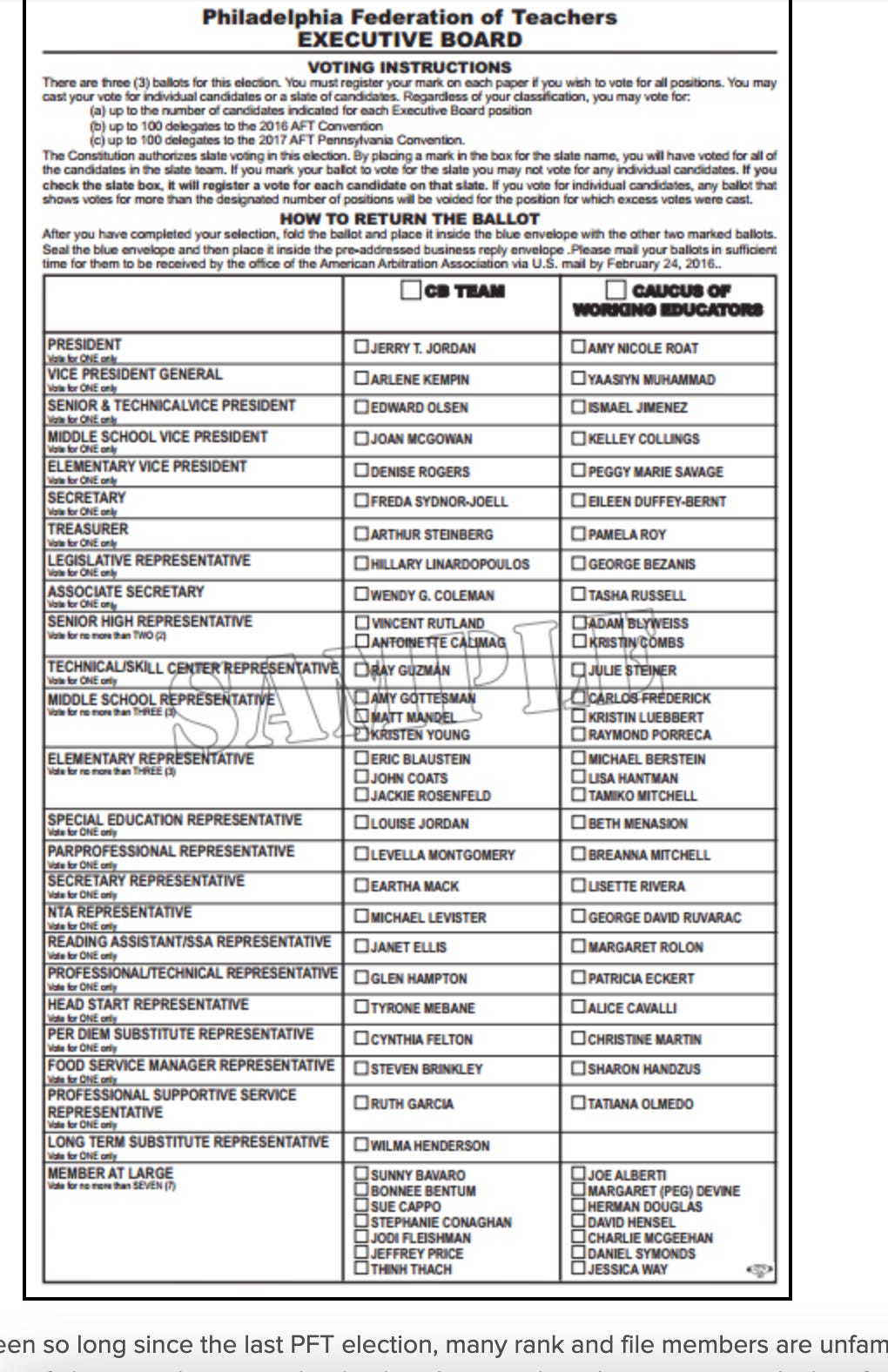 Below is a ballot for the executive board of the PFT - as you can see, the Caucus of Working Educators put up a slate of candidates, including Ismael Jimenez.
